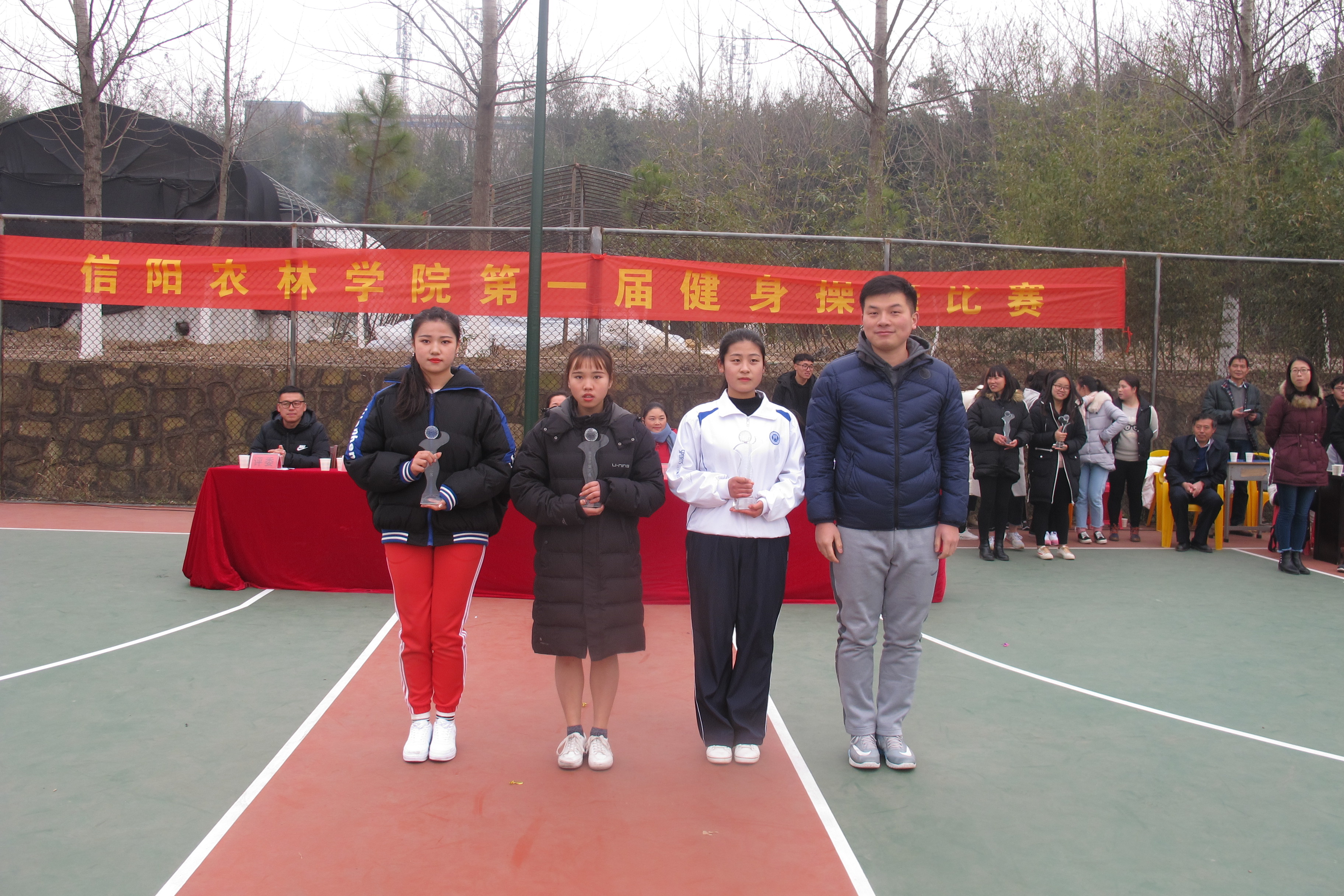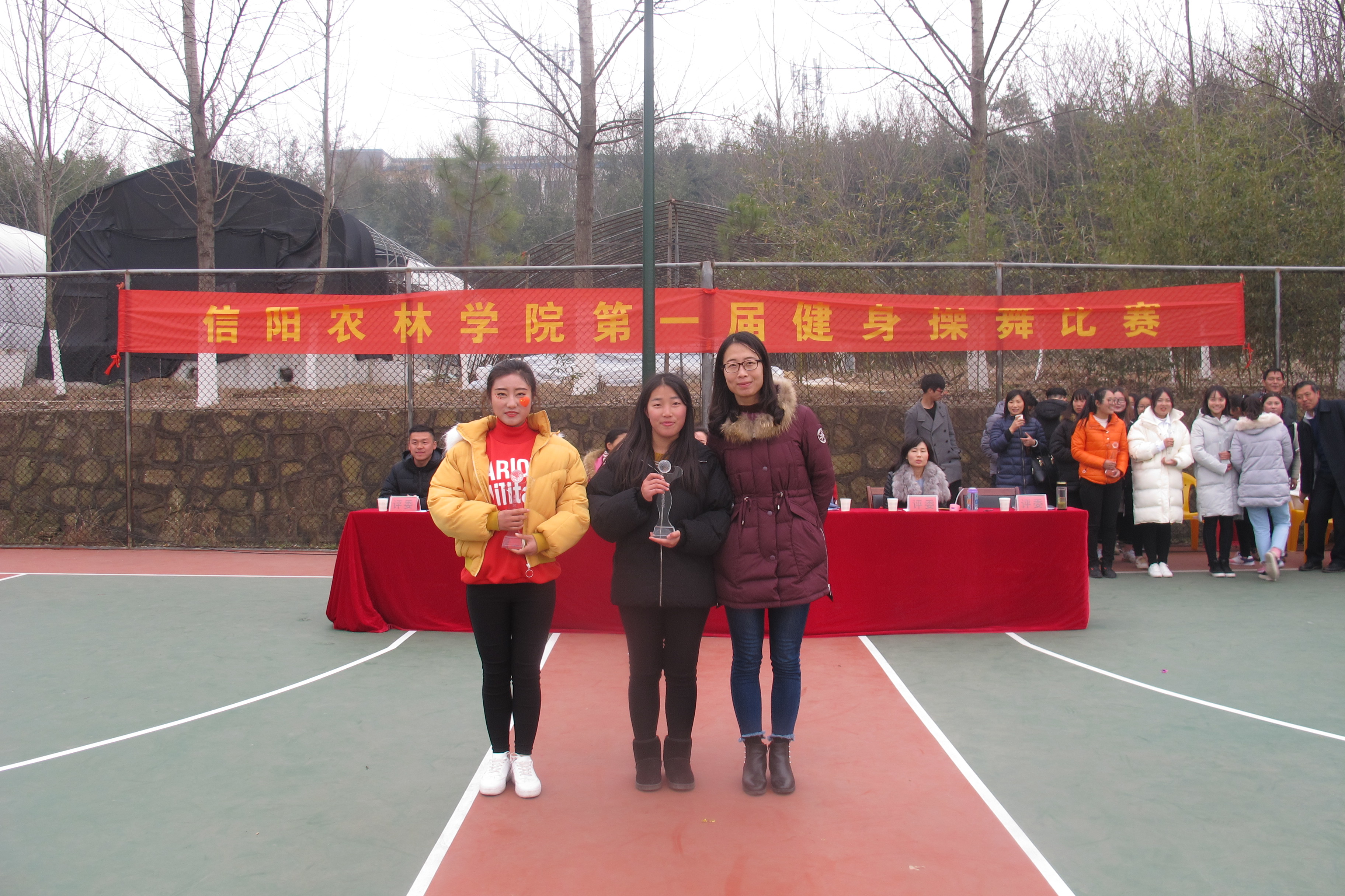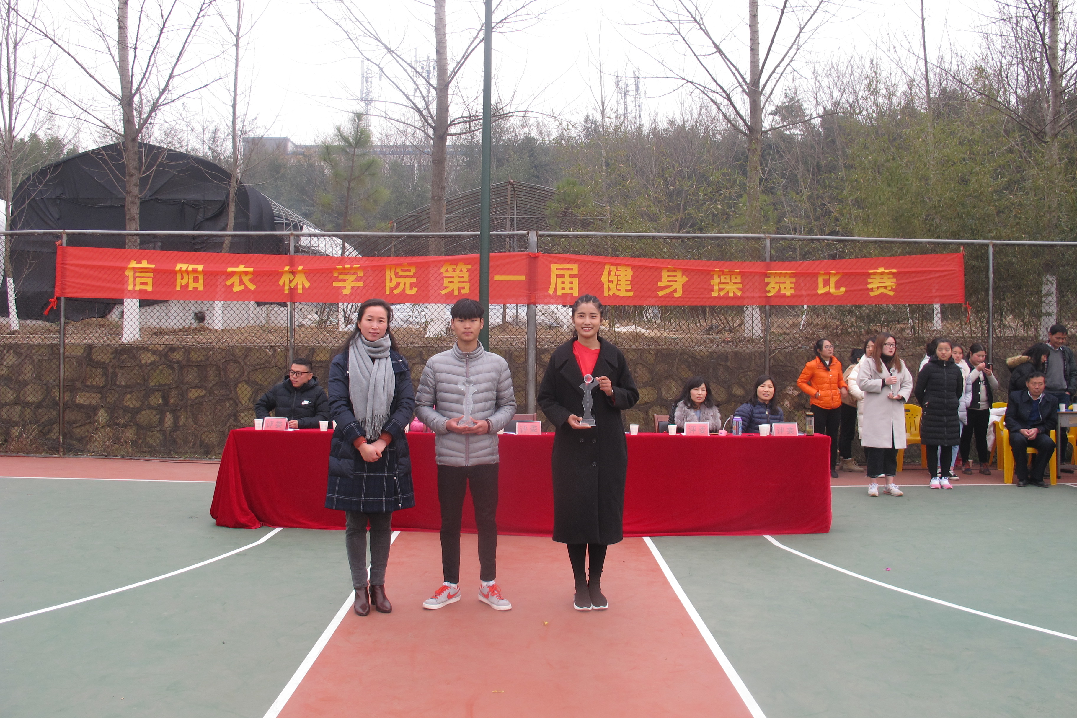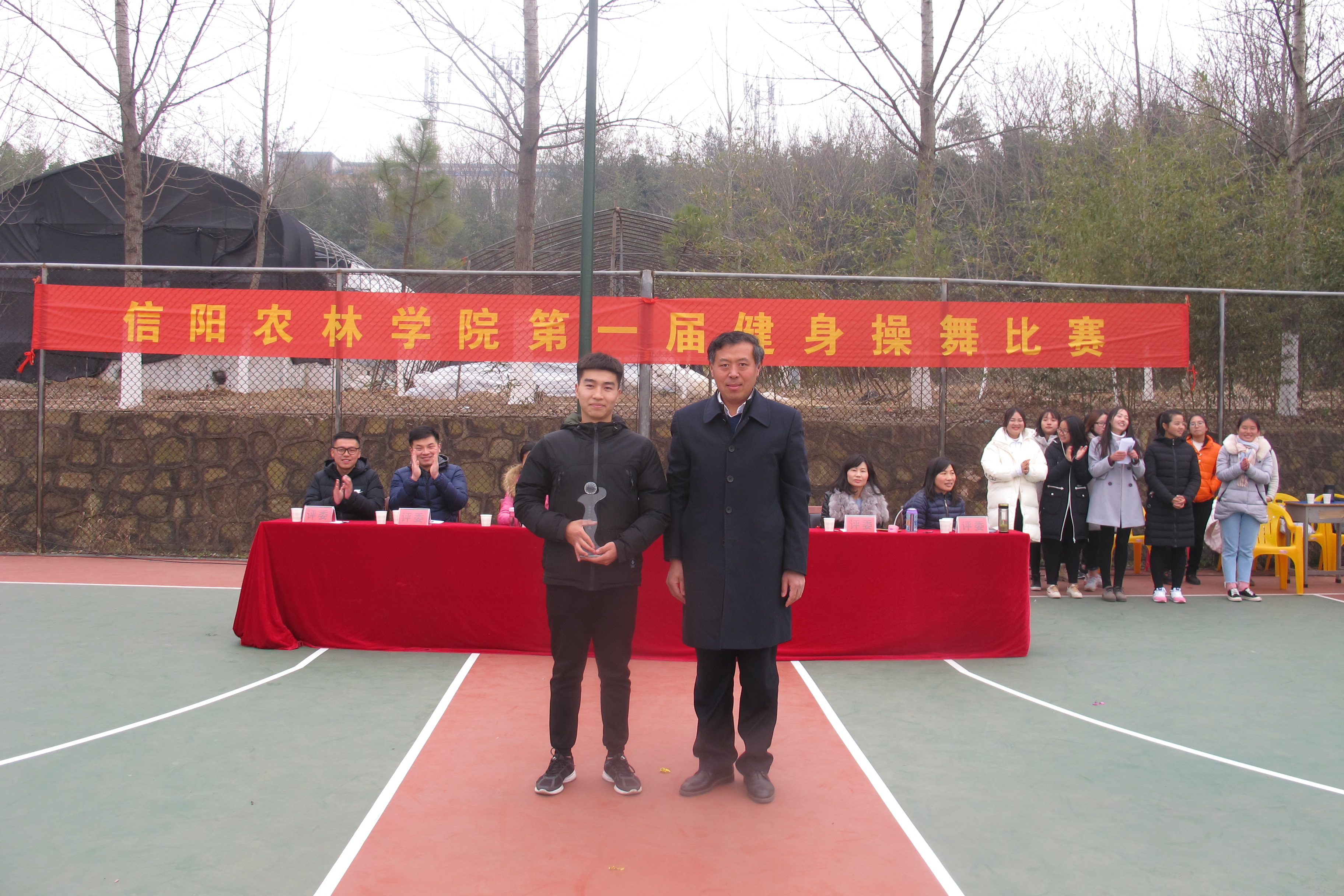 12月24日下午,beat365在线平台官网首届健身操舞比赛在beat365在线平台官网篮球场举行,来自14个学院的28支参赛队伍840多名运动员参加了比赛。经过激烈角逐,最终,工商管理学院获得团体总分一等奖,规划与设计学院、园艺学院荣获二等奖,旅游管理学院、外国语学院、生物与制药工程学院荣获三等奖,林学院代表队荣获优秀组织奖,食品学院获道德风尚奖。比赛结束后举行了隆重的颁奖仪式。体育教学部副主任李俊、团委组宣部部长孙丽琴、学生处陈帅名、体育教学部李曼筠分别为获奖队伍颁发了奖杯。