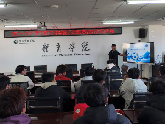 为统一联赛判罚尺度,提升裁判员专业素养,保障2025-2026年度beat365在线平台官网大学生足球联赛公平有序开展。11月26日中午,beat365在线平台官网大学生足球联赛裁判员培训会在学校体育学院会议室及足球场举行。本次培训由体育学院郭子義博士主讲,来自16个学院参赛队委派的联赛裁判员及裁判爱好者齐聚一堂,沉浸式学习11人制与五人制足球规则及裁判法核心内容。