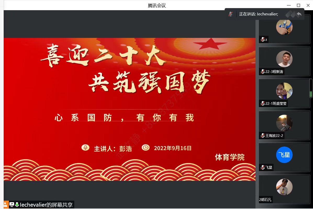 喜迎二十大,共筑强国梦。为了弘扬爱国主义精神,普及国防知识,9月16日上午,体育学院开展了“传承红色基因,汇聚强军力量”国防主题教育,院团总支书记彭浩主讲,2022级休闲体育专业全体新生参加。