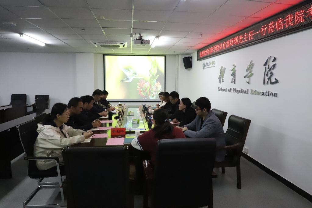10月14日下午,信阳学院公共体育教学部主任周曙光一行7人来我院考察交流,学院全体领导班子及教师代表参加交流座谈会,会议由学院党总支书记李耕主持。