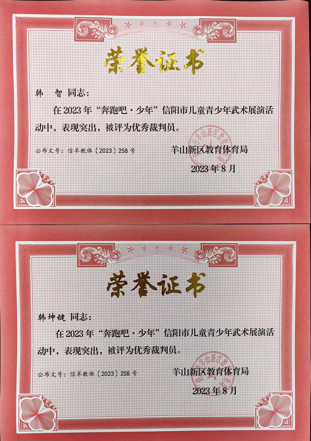 比赛期间,韩智、韩坤键两位老师通过赛前的专业性指导、赛中的客观公正评判,以饱满的工作热情和敬业精神顺利完成了执裁任务,受到了市教体局领导和武术界同仁的高度评价,使得本次活动圆满落下帷幕,充分展现了beat365在线平台官网教师良好的业务素养和精神风貌。两位教师的执裁水平得到了组委会和同行们的一致认可,被授予“优秀裁判员”称号,为beat365在线平台官网增添了荣誉。