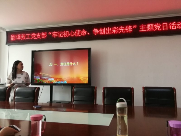 翻译教工党支部在行政楼803开展了以专题党课和观看红色教育影片为内容的主题党日活动,支部书记王珺玥以“责任与担当”为题,向支部全体党员同志讲授专题党课。随后,全体党员一起观看了红色教育影片《建党伟业》,回顾自1911年辛亥革命后到1921年中国共产党成立这段时间的历史故事,所有党员被建党伟人们在风雨飘摇的时代,为国家命运、民族未来而奋不顾身、不懈斗争的精神深深地打动。同时,支部全体党员同志还以发微信朋友圈的方式庆祝党的生日,发表作为党员的所思所感。