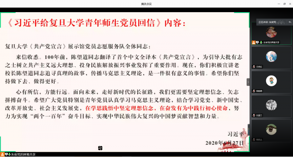 学生第一、二党支部通过线上主题党日活动的形式开展。全体学生党员通过重温入党誓词、学习“红船精神”和《习近平给复旦大学青年师生党员回信》精神、学生党员代表朗诵诗歌为党的99岁生日献礼。作为新时代大学生要深入学习习近平新时代中国特色社会主义思想和党的十九大精神,从党领导人民奋斗的历史和当下中国发展的实践中汲取营养,学思践悟,奋发有为,做新时代的青年奋斗者和圆梦人。