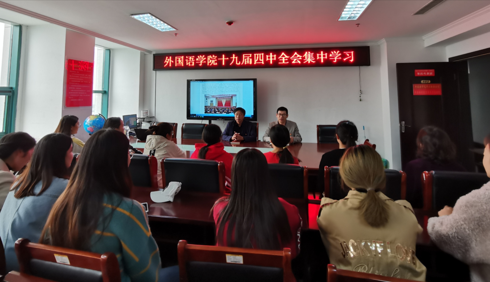 为深入学习贯彻十九届四中全会会议精神,11月6日上午,外国语学院于院办803召开学习党的十九届四中全会精神专题学习会,会议由我院党总支书记张志强主持,院党总支副书记吴宏及部分教工党员和学生党员参加了学习会。