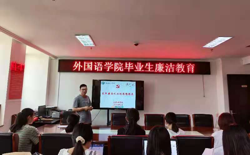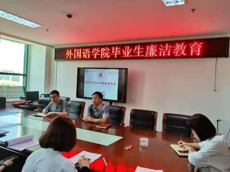 为进一步提高我院毕业生的廉洁意识,夯实理想信念,筑牢拒腐防变的思想防线,6月4日上午,外国语学院在行政楼803开展了2021届毕业生廉洁教育主题活动。我院党总支书记张志强、副书记吴宏,毕业生党员代表、毕业生代表参会,会议由团总支书记范琼琼主持。