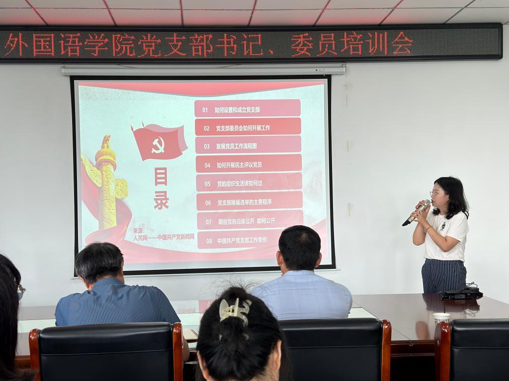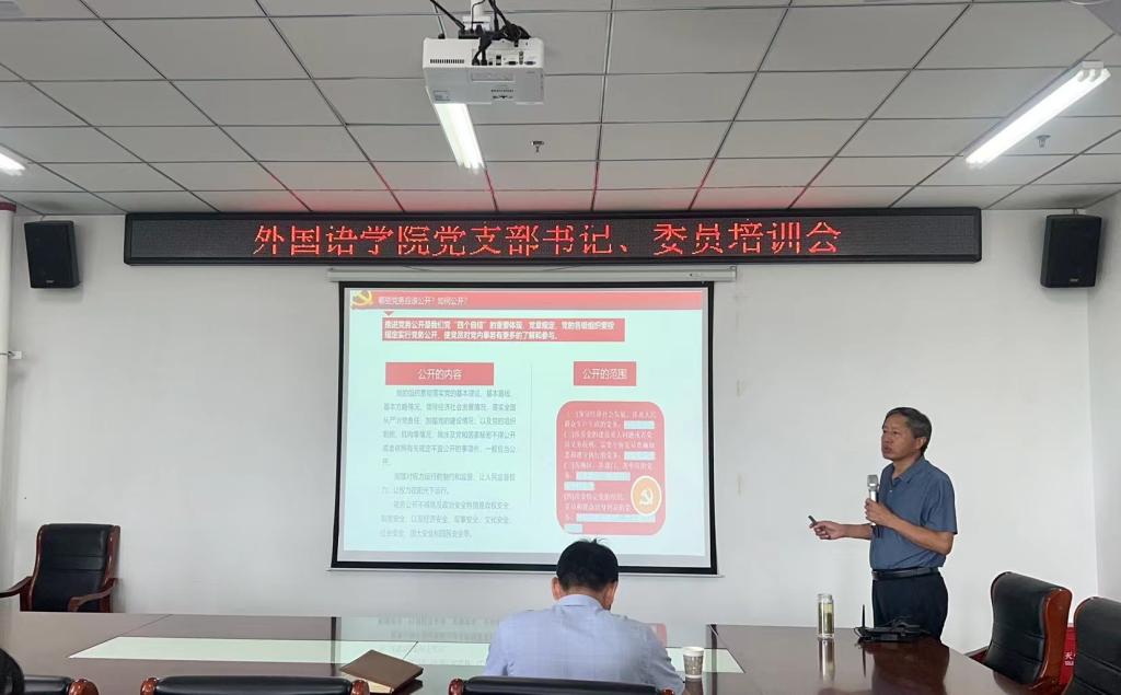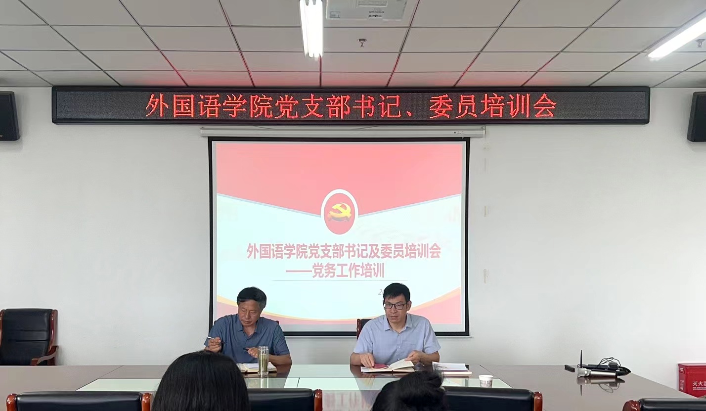 2023年8月29日上午,外国语学院党总支在文学艺术中心402会议室召开2023年度党支部书记及委员培训会,会议由党总支书记张志强主持,党总支副书记吴宏、专职组织员朱俊梵、各党支部书记及支部委员参加了本次培训。