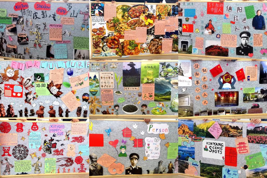 信阳红色历史板块中,学生们了解到吴焕先同志、肖国清同志、许世友同志的事迹,于资料库中寻访何家冲革命老区、大别山革命英雄纪念碑等革命根据地,并与息夫人,孙叔敖等历史人物产生链接;走进非遗民俗文化中,学生们领略到叶雕、泥塑、石头画、剪纸、皮影以及信阳茶文化等一众趣味十足的民俗艺术;驻足风景美食展板前,色泽诱人的焖罐肉、面炕鸡,风景秀丽的鸡公山、灵山、文新茶山让大家一睹北国江南的风采。对文化内容的讲解、展板的展现以及结合外国语专业特色的注释,打造了一场满富观性和探索性的文化之旅