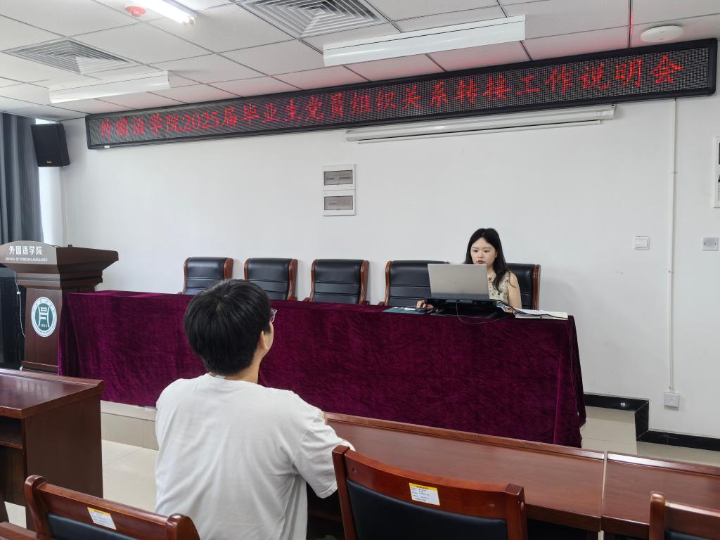 为进一步规范党员组织关系转接工作程序,扎实推进2025届毕业生党员组织关系转接工作有序开展,6月9日下午,外国语学院于学院205会议室和线上同步组织召开毕业生党员组织关系转接工作说明会。会议由学院专职组织员朱俊梵主持,2025届全体毕业生党员参会。