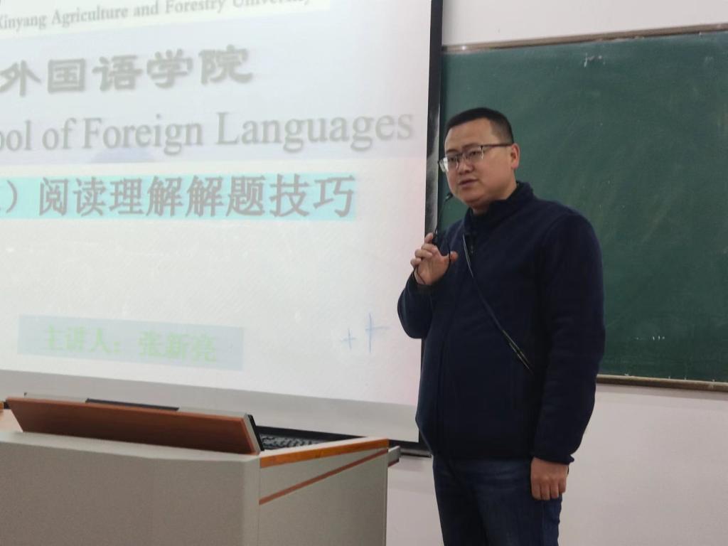 2023112319:00-21:00,外国语学院考研英语服务团队于二教205教室开展了2023年第场讲座。本次讲座以英语阅读理解解题技巧为主题,由外国语学院张新亮老师主讲,全校近百余名学生到场学习。