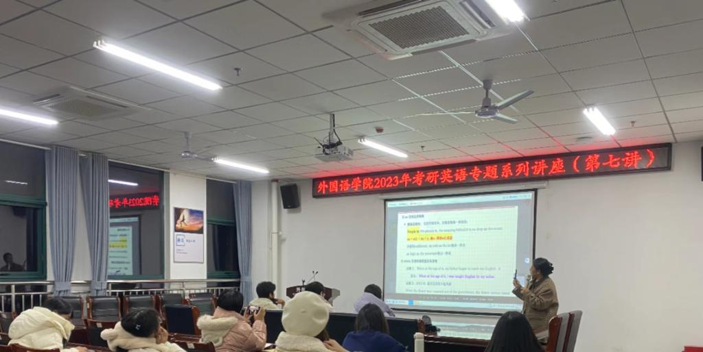 2023年12月14日19点,外国语学院在文学艺术楼402开展考研英语专题系列(七)---考研英语大作文冲刺讲座。此次讲座由蔡鸣老师主讲,全校参加2024年度考研的学生及其他有意向考研的学生参加了此次讲座。