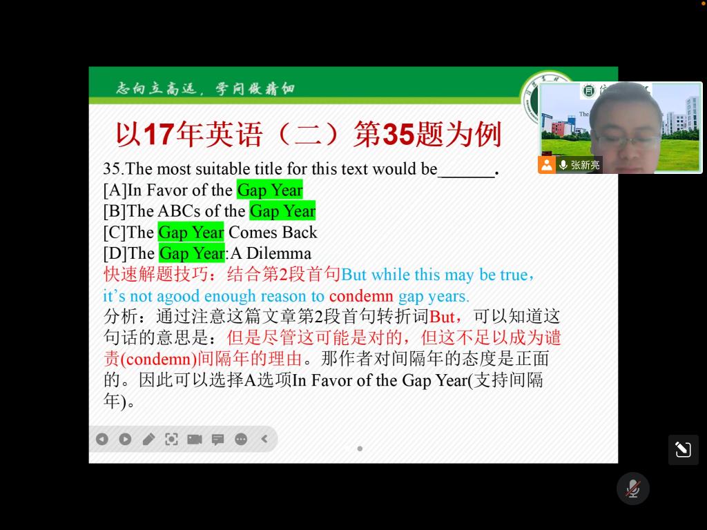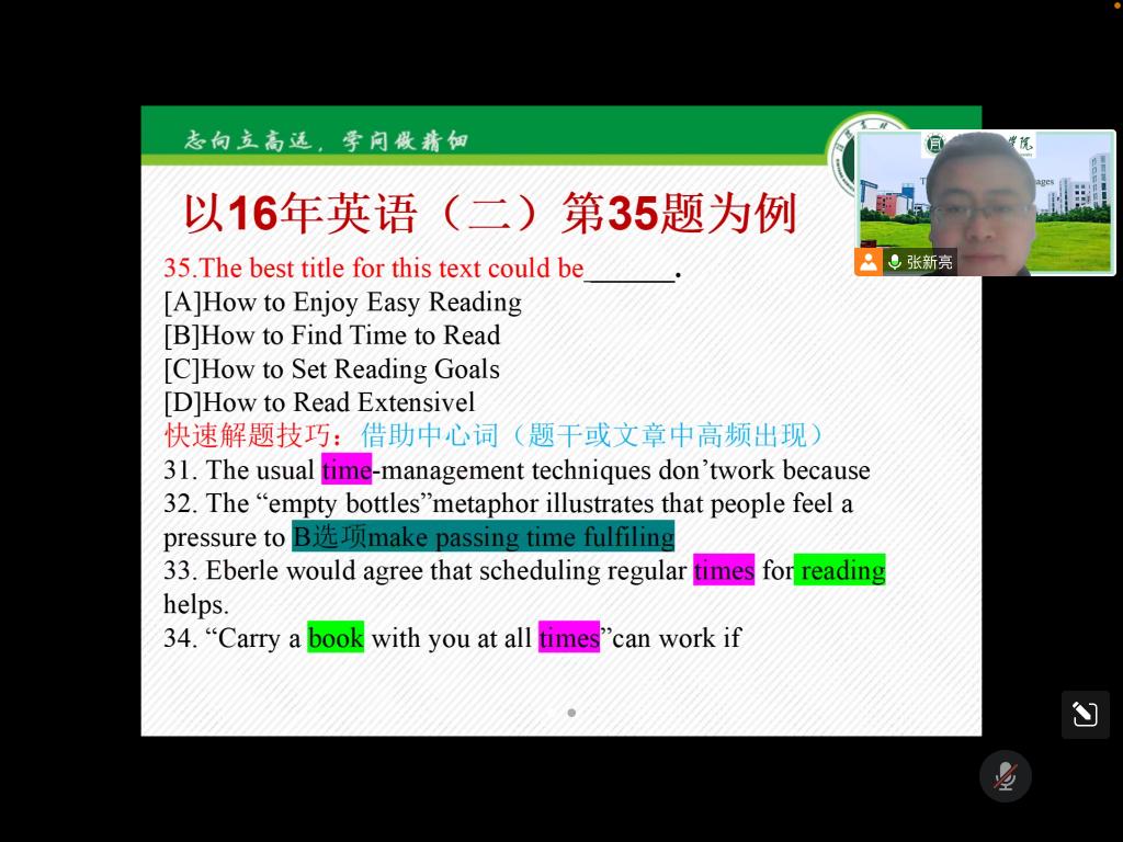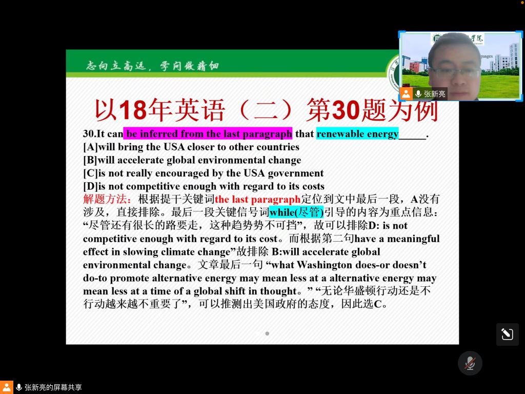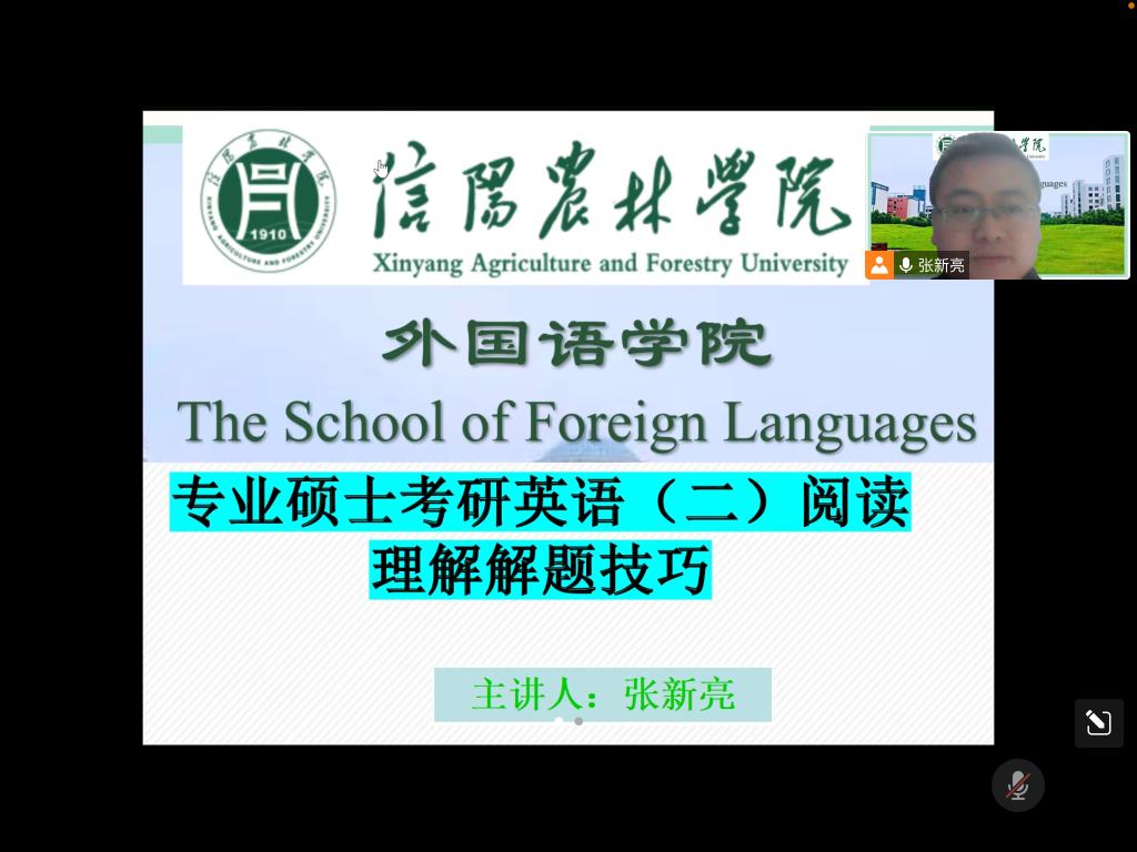 为帮助beat365在线平台官网学生更好掌握考研英语阅读理解的答题技巧,提高复习效率。11月28日晚上7:00,由我院副院长芦晓莉博士组织成立的外国语学院考研英语服务团队通过腾讯会议面向beat365在线平台官网本科生进行了考研英语专题系列的第四期讲座——“考研英语(二)阅读理解解题技巧”,此次讲座由张新亮老师主讲。