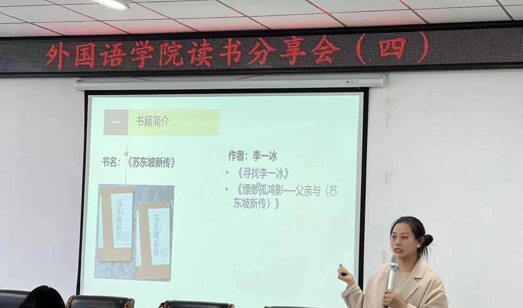本次分享会由副院长蔡鸣进行分享,她从书籍简介、新在何处、分享缘由三个方面就书籍《苏东坡新传》与大家进行了分享。她首先由猜猜“他”是谁引出人们对苏东坡的常规印象,然后由介绍该书作者引出书籍的序言《寻找李一冰》《缥缈孤鸿影──父亲与〈苏东坡新传〉》及书籍主要内容,然后分享了该书为何名为新传:一是前有林语堂版本的苏东坡传;二是由于作者李一冰对苏东坡形象有了新的解读。本书中苏东坡的豁达不是与生俱来的能力,而是其与命运搏斗过程中勇敢的选择;三是其新颖的写作方法:以苏轼留下浩繁诗文“自述”其跌宕的人生轨迹,以史料为依据再现出北宋的文化与时局。接着她提到分享该书缘由:一是书中语言、书画俱佳,以健朗细致的笔墨呈现了北宋的时代沉浮,加之作者共鸣式地叙述、真诚地写作态度,用足以让人共情的讲述方式让人看到了一个立体的苏东坡;二是书中除形象饱满的苏东坡外、还刻画了王安石、欧阳修等众多群像,让人可借由此书延伸了解其它人物进而详细了解整个宋朝历史的兴趣;三是苏东坡的人生也许可以给处在各种境遇下的人们提供精神食粮。人们共同享有从大地上生长出的悲欢苦乐,而从苏东坡的经历中能汲取力量和勇气,去抵达天悠地阔的世界。