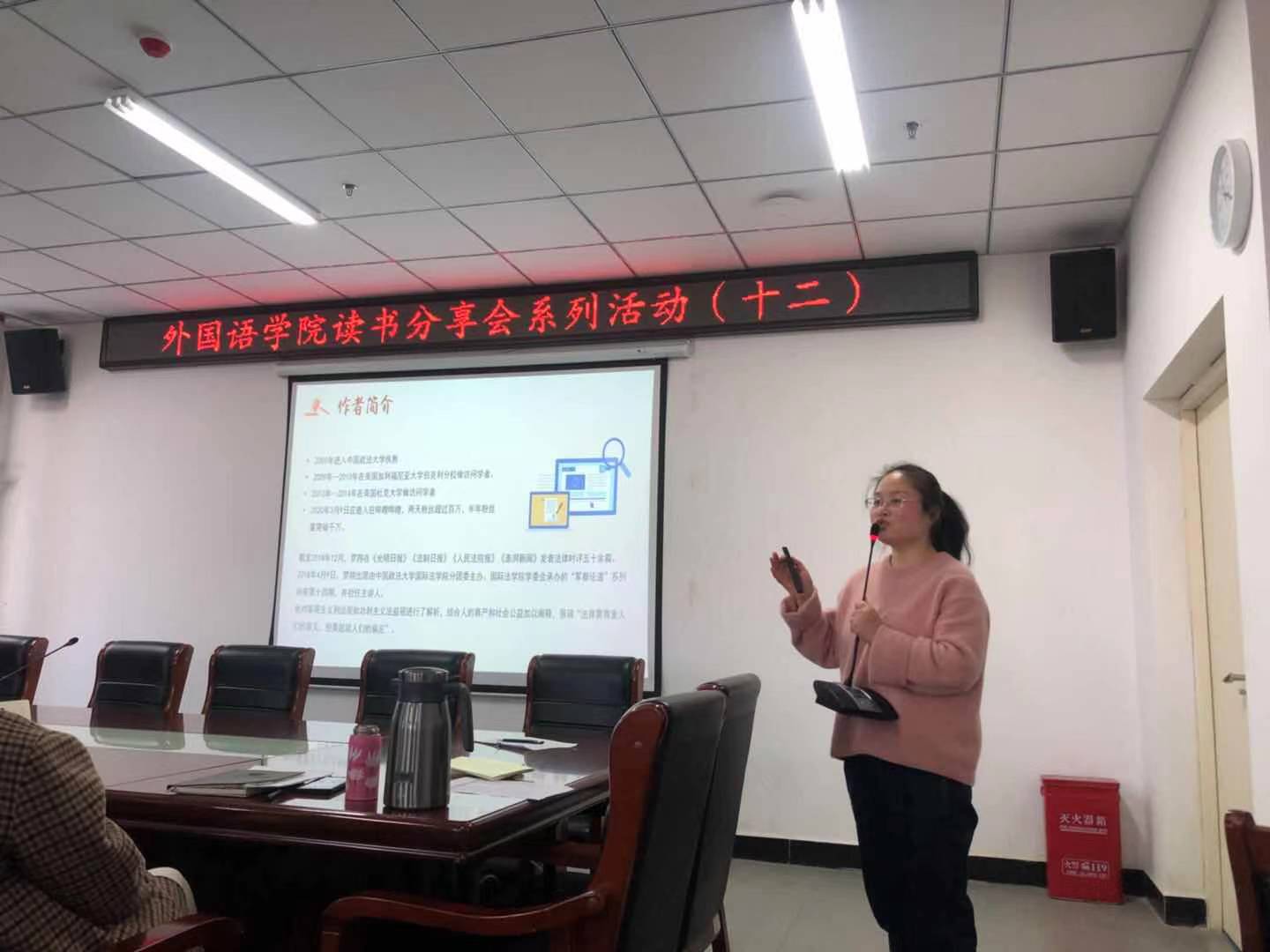 12月12日下午,外国语学院在文学艺术楼402会议室开展读书分享会系列活动(十二),主讲人赵瑞老师此次分享的书为《法治的细节》,学院全体教师参加了此次活动。