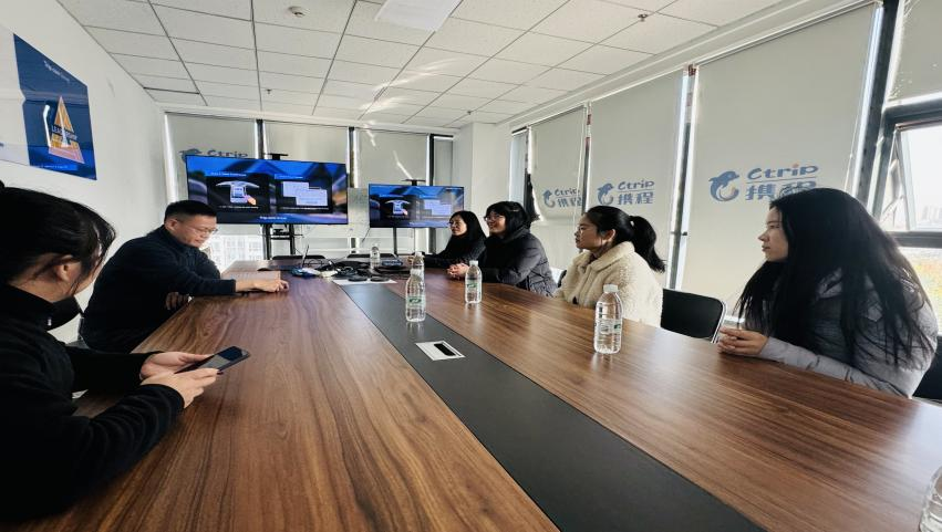 第二站,教师团队访问了携程旅行网华中服务联络中心。在总经理的陪同下,教师们参观了公司的国内运营部和海外运营部。方总介绍了公司的发展概况、企业文化,并强调了对英语人才的需求。双方就学生专业认知实习的合作意向达成了共识。