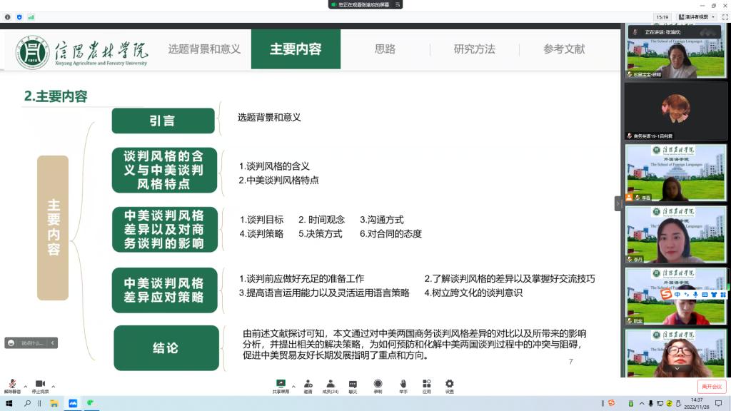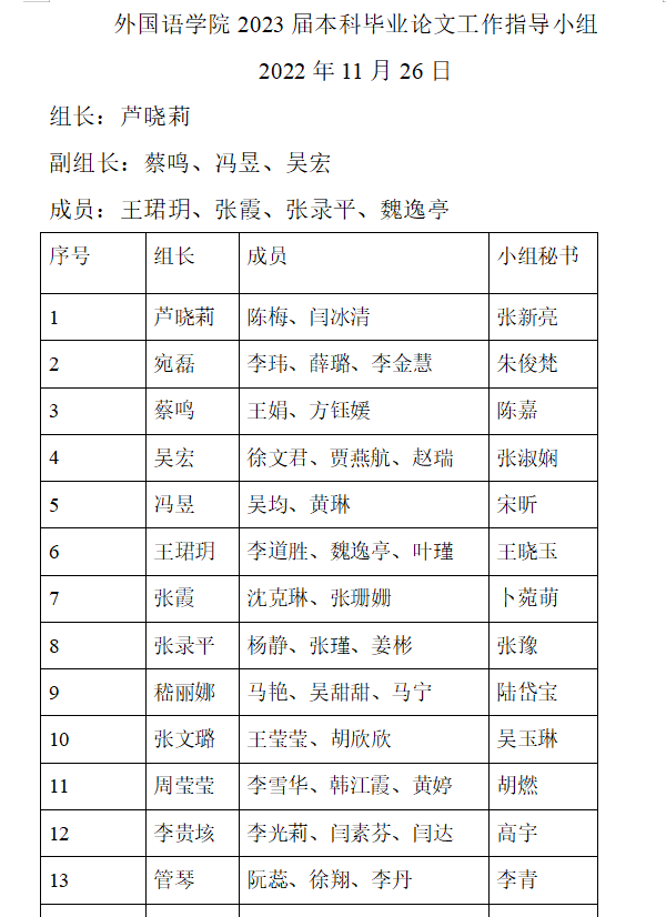 外国语学院于2022年11月26日以线上形式举行了2023届本科毕业论文开题答辩。工作开展前期,外国语学院成立了2023届毕业生开题答辩工作小组,副院长芦晓莉任组长,副院长蔡鸣、冯昱及副书记吴宏任副组长,小组成员为商务英语教研室主任张霞、翻译教研室主任王珺玥、公共英语教研室主任张录平及教学秘书魏逸亭。
