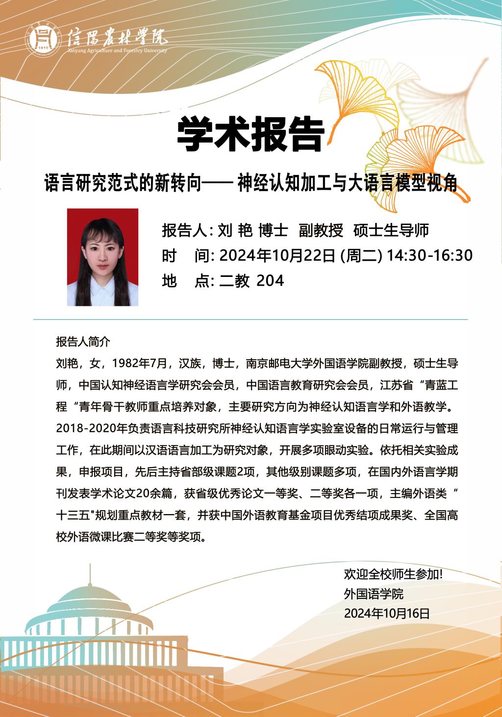 10月22日下午2点30分,外国语学院荣幸邀请到南京邮电大学的刘艳博士,在第二教学楼204室举办了一场题为“语言研究范式的新转向——神经认知加工与大语言模型视角”的学术报告。报告由副院长冯昱主持,吸引了全院专任教师及众多学生的热情参与。