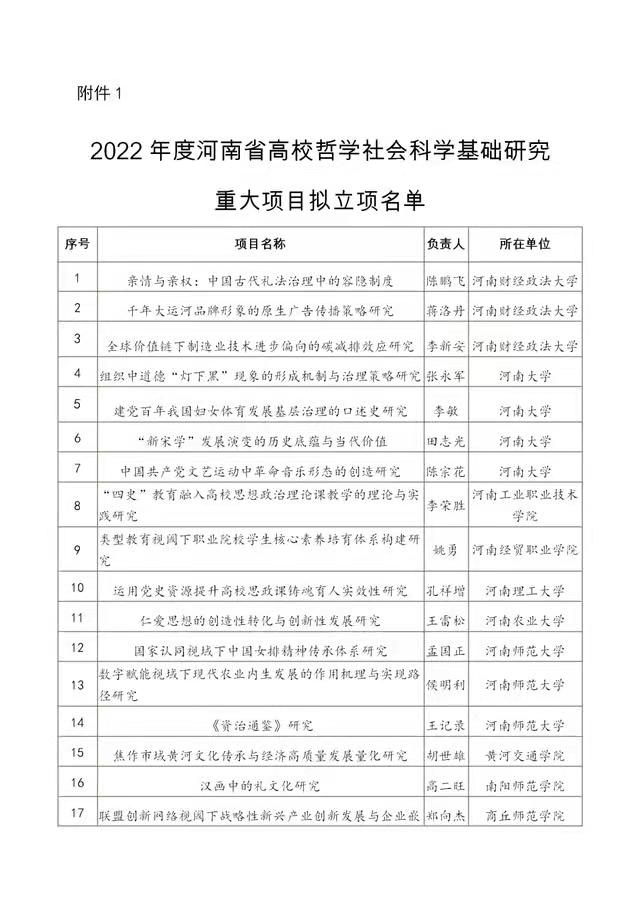 近日,2022年度河南省教育厅高等学校哲学社会科学基础研究重大项目立项。