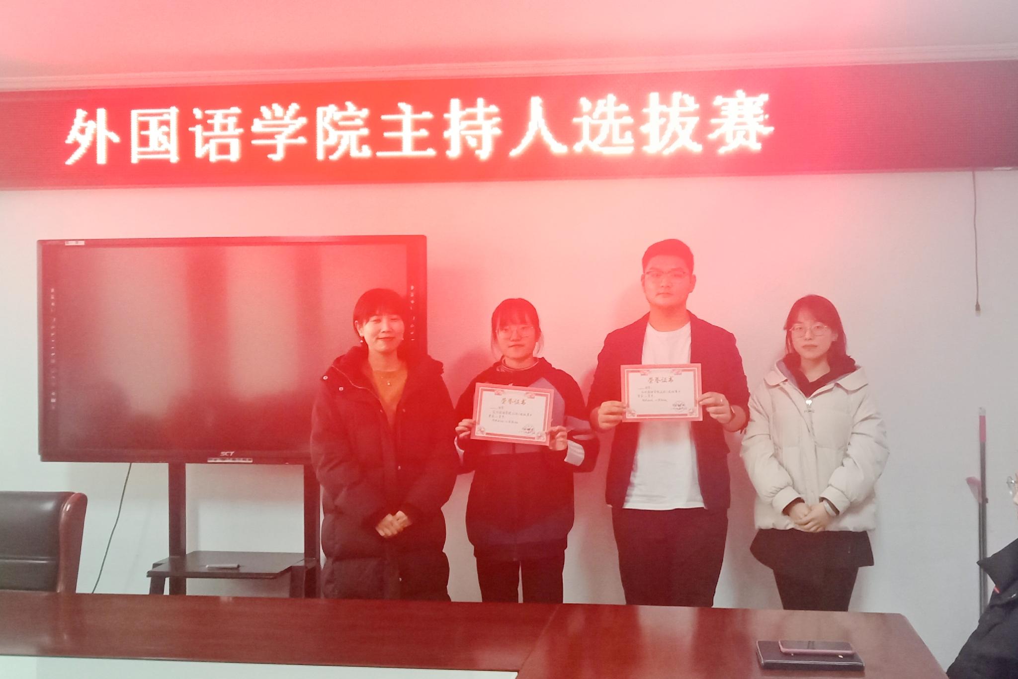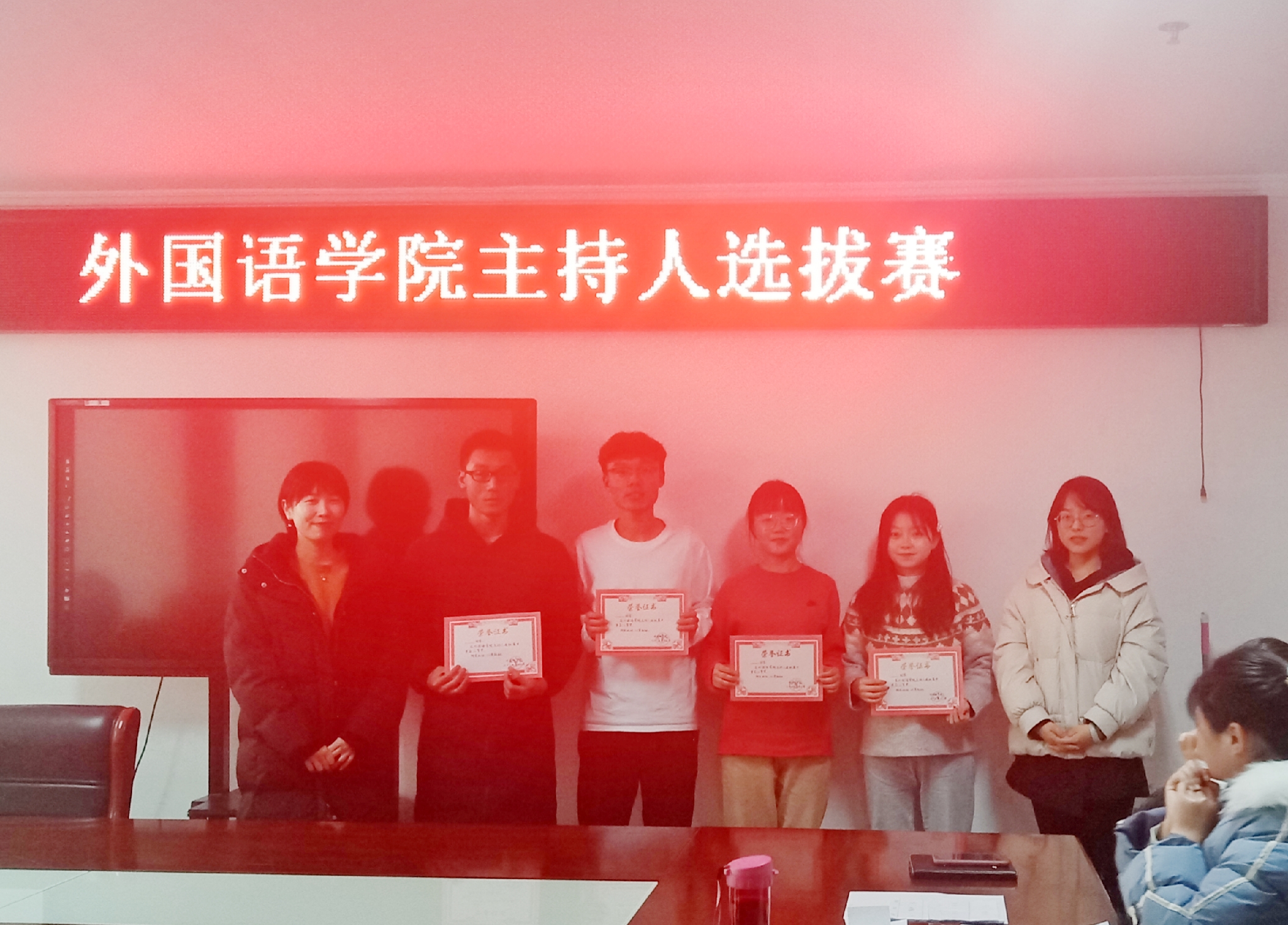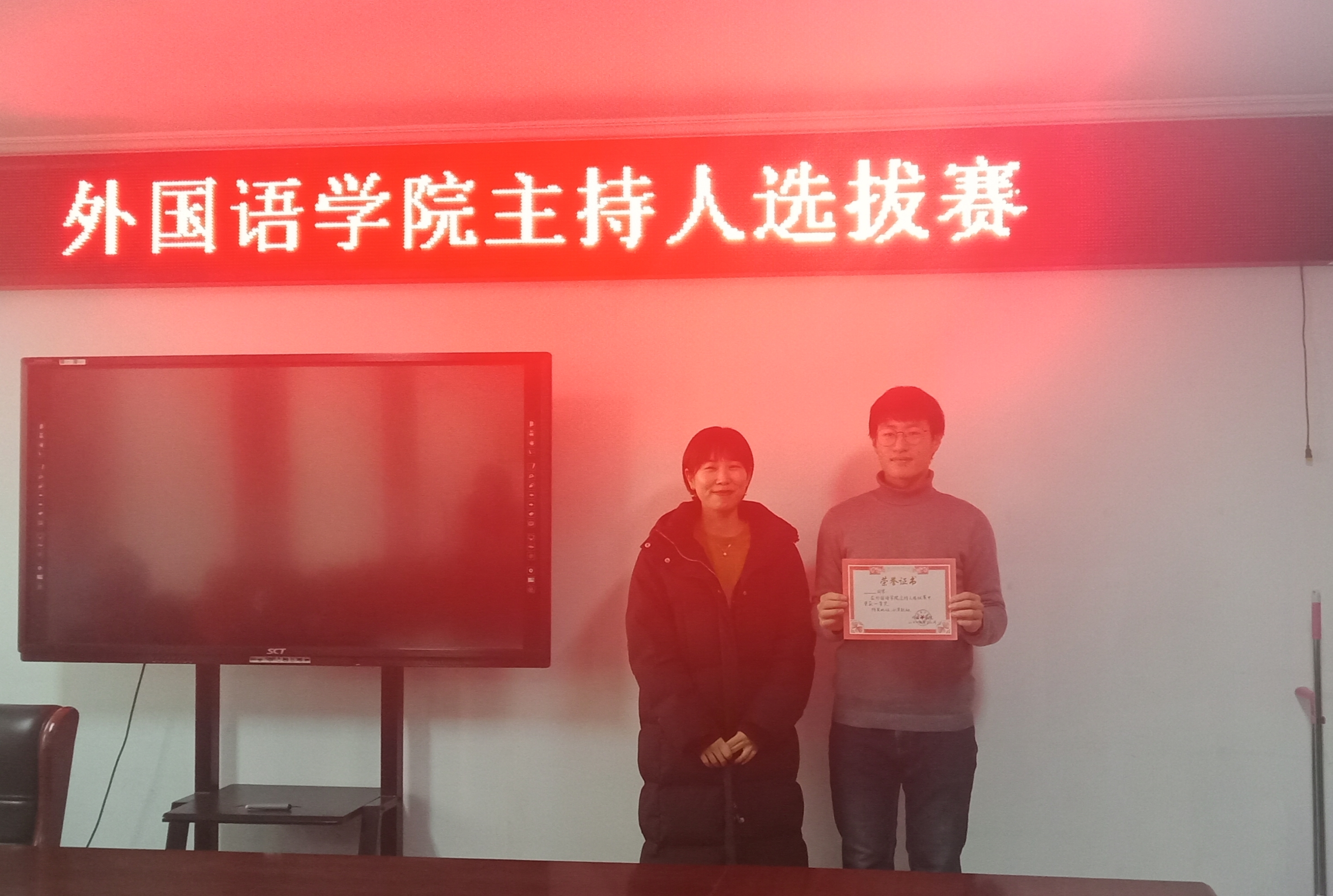 1217日中午,外国语学院主持人选拔赛于行政楼803会议室举办,我院团总支书记范琼琼、2019级辅导员高宇担任评委老师,学生会代表岳子豪主持,19级刘培基、黄鑫娜、李京昊等七名同学参赛。