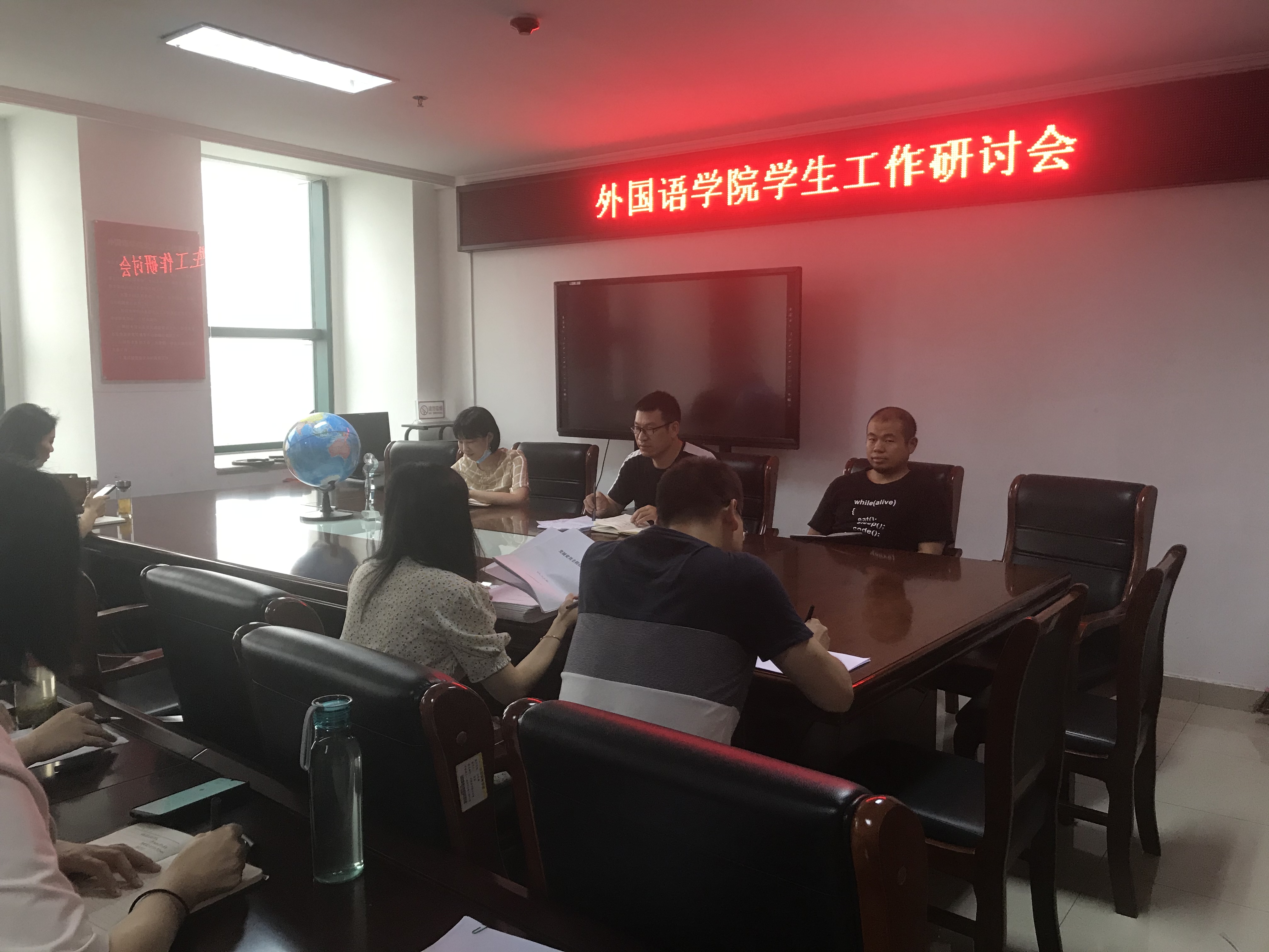 69日,外国语学院在院办803召开学生工作研讨会。学院党总支副书记、学工组组长吴宏、团总支书记范琼琼、学工组全体辅导员参会,会议由吴宏主持。