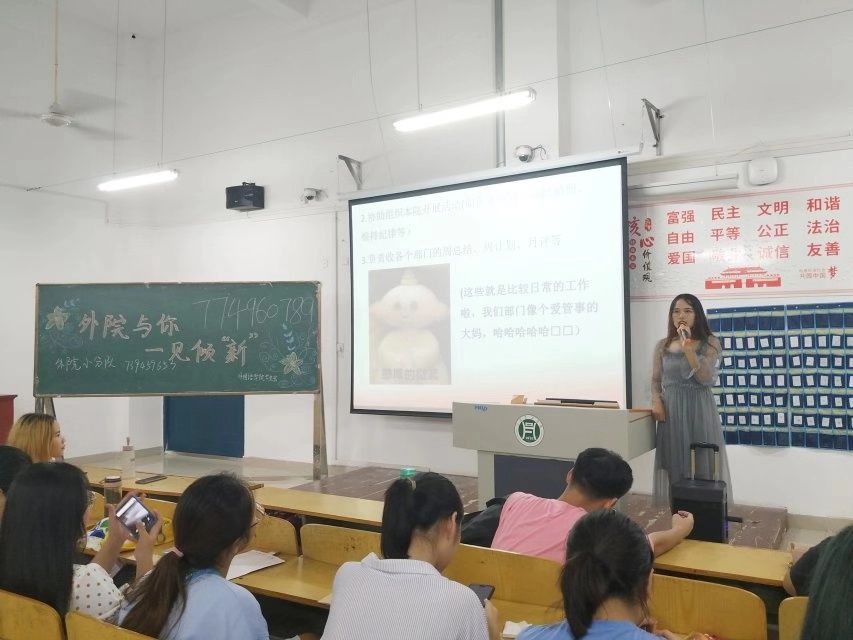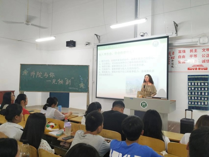 帮助新生更快适应大学生活,提高学习热情,坚定其理想信91119点,外国语学院分别于二教404406同时开展了以"外院与你,一见倾新"为主题的新老见面会暨学生职能介绍大会,外国语学院主席团成员、学生会各部门代表以及全体19新生参会。