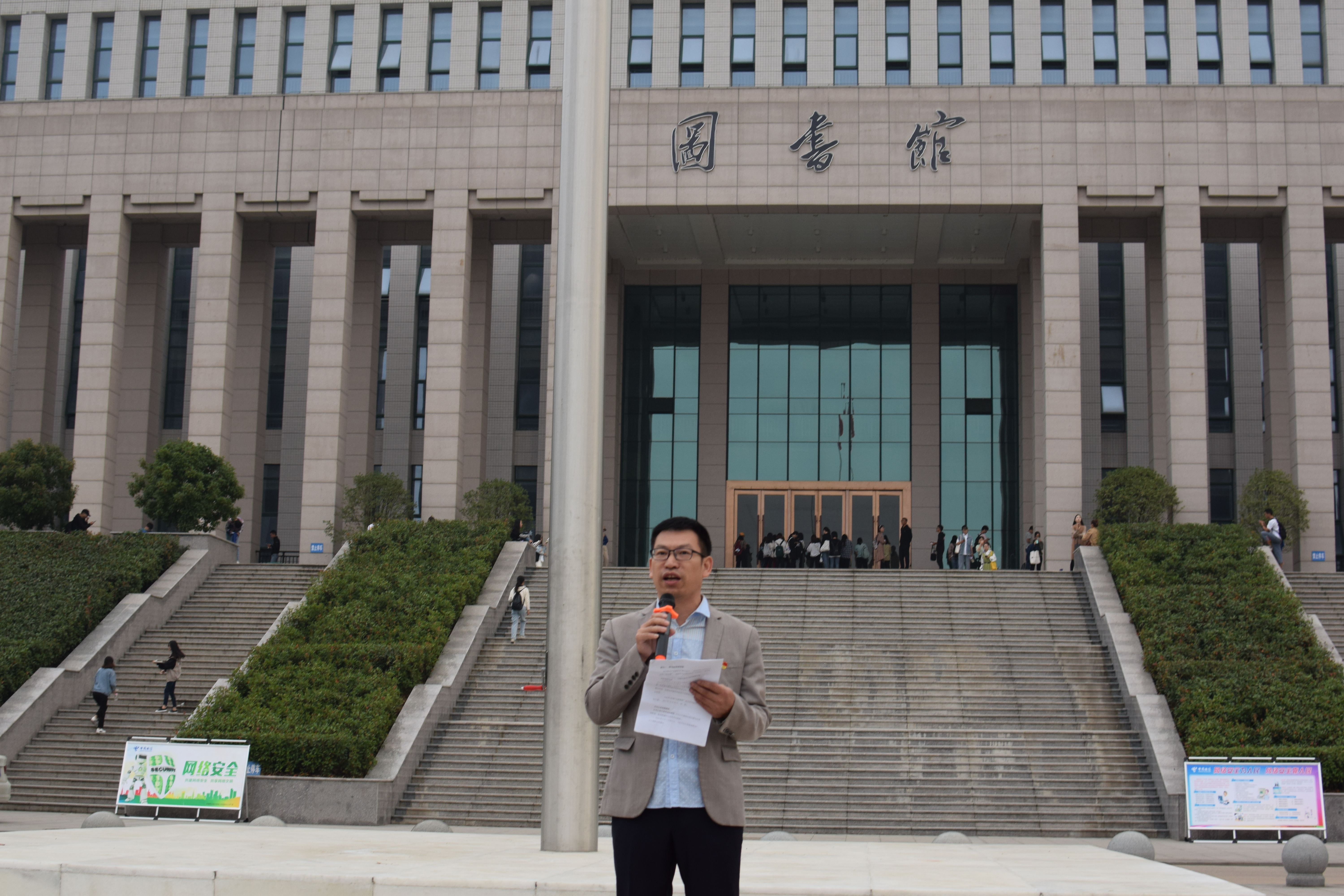 秋意微起,拂晓黎明。时逢新中国成立70周年之际,为进一步加强青年学生爱国主义思想教育,传承爱国主义传统,营造弘扬爱国主义精神的良好氛围,唱响礼赞新中国、奋进新时代的青春主旋律919日早上6时许,外国语学院在图书馆前汝宁广场举行以“我与祖国共奋进——国旗下的演讲”主题的团日活动。组织员、学工组组长吴宏、团总支书记范琼琼、学生干部代表以及全体2019新生参加了本次主题团日活动。