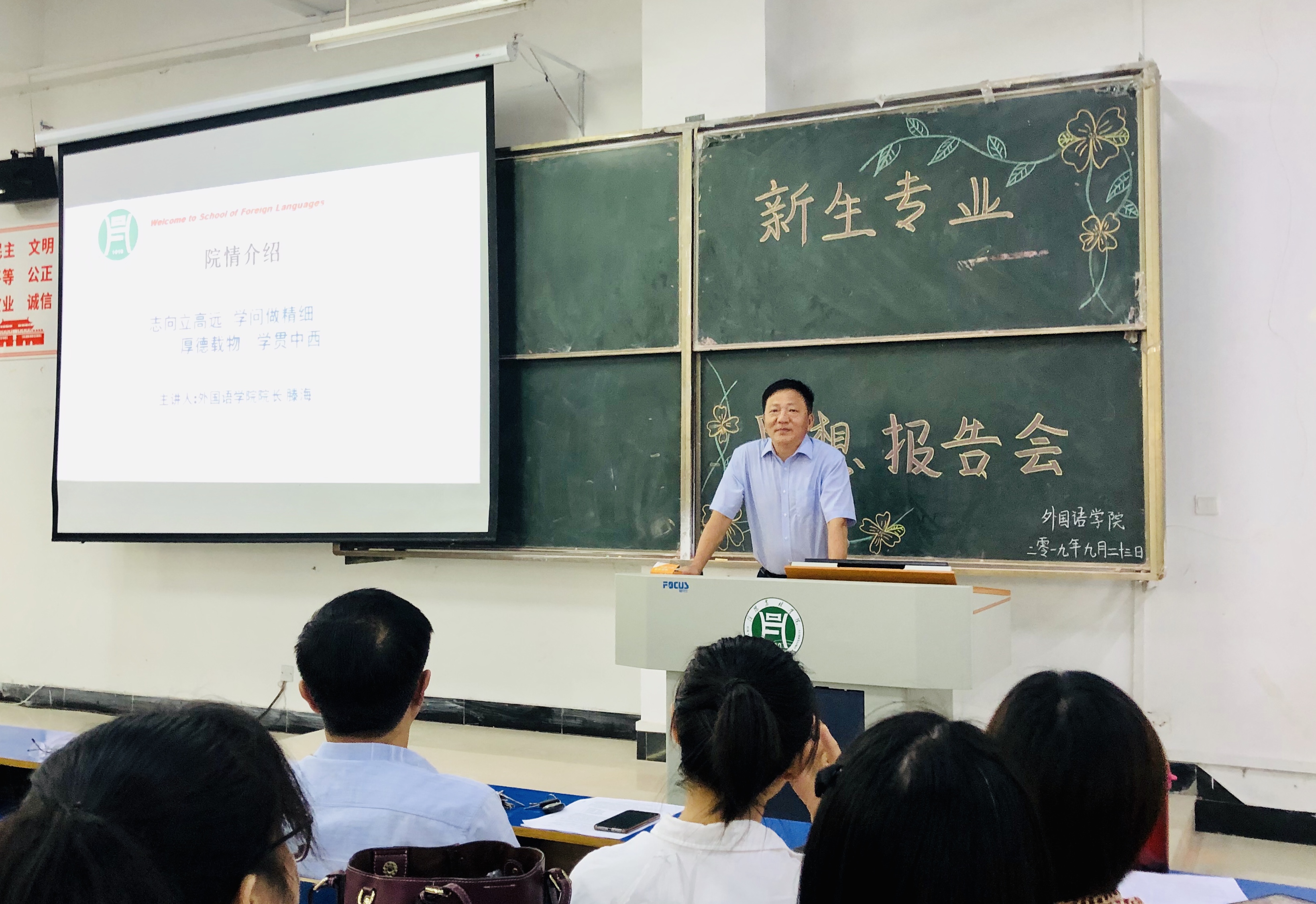 923日下午,外国语学院于一教E102召开了2019新生入学教育系列活动(二)——校情院情介绍。外国语学院院长滕海、党总支书记张志强、组织员、学工组组长吴宏情景模拟实验室主任徐翔语音实验室主任蒋博如、青年教师代表闫达、张霞,17级辅导员朱俊梵、陆岱宝19级新生辅导员及全体新生参加了本次报告会会议由我院团总支书记范琼琼主持。
