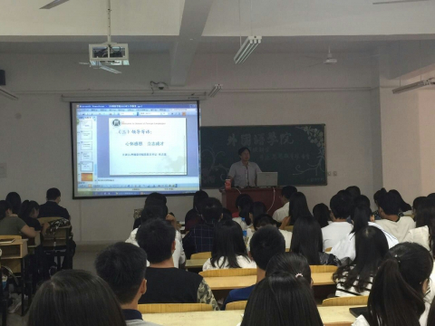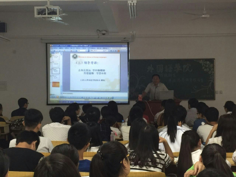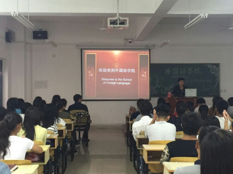 报告会上,黄院长首先介绍了外国语学院的基本情况,并重点介绍了商务英语本科专业的师资队伍、课程设置以及教学特色和社团活动,并代表全体教师对新生提出“做自己命运的主人”、“学习造就自己”等期望。应用英语教研室主任郑虹老师用双语详细介绍了应用英语专业的教学目标、学习课程、教学措施、职业规划等内容,在教学措施方面鼓励大家勇敢地与外教对话,并强调第二外语的学习。