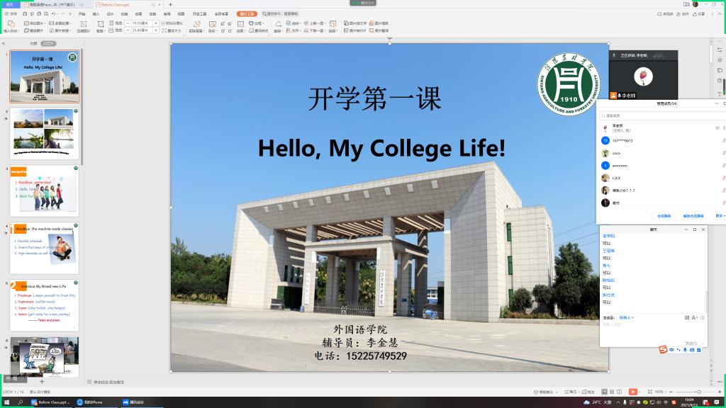 下午,辅导员们组织了新生线上见面会,同学们依次进行自我介绍,其主题包括兴趣、爱好、地域文化、家乡美食、未来理想等方面,同学们就此展开了热烈地讨论,在此过程中增进了同学们之间的友谊,拉近了师生间的距离。为新学期的到来打下了坚实的基础。外国语学院 李丹