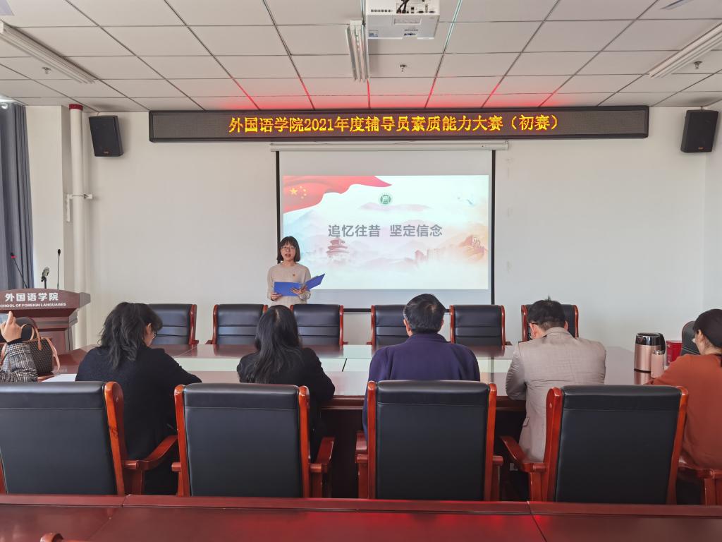为进一步加强辅导员队伍建设,提升辅导员的职业技能和工作水平,推动我院辅导员职业化、专业化发展,11月18日中午,外国语学院在院办402举办了辅导员素质能力大赛初赛。党总支书记张志强、副书记吴宏、副院长芦晓莉、商务英语教研室主任张霞、翻译教研室主任王珺玥、商务英语党支部书记张录平受邀担任本次比赛的评委。