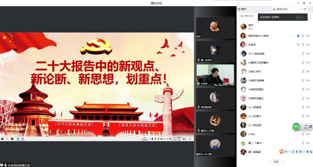 2022年11月24日,外国语学院举行“二十大报告中的新观点、新论断、新思想”主题讲座,讲座由党总支书记张志强主讲,副院长蔡鸣、组织员朱俊梵、团总支书记高宇及学院300余名学生代表通过腾讯会议参与了讲座。本次讲座也是外国语学院第二课堂系列(二)——提升文化素养、增强文化自信的重要内容之一。