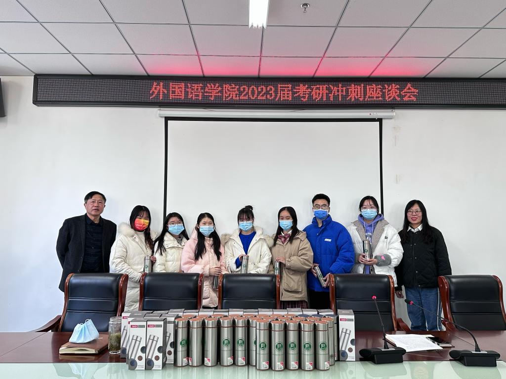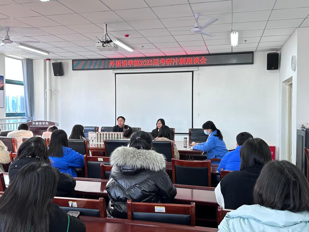 为帮助2023届毕业生缓解考研冲刺阶段焦虑情绪,科学规划、提质增效,外国语学院于12月2日下午在艺术楼402召开了2023届考研冲刺座谈会。院党总支书记张志强、副院长芦晓莉及毕业班辅导员黄婷、高宇参加了本次座谈会。