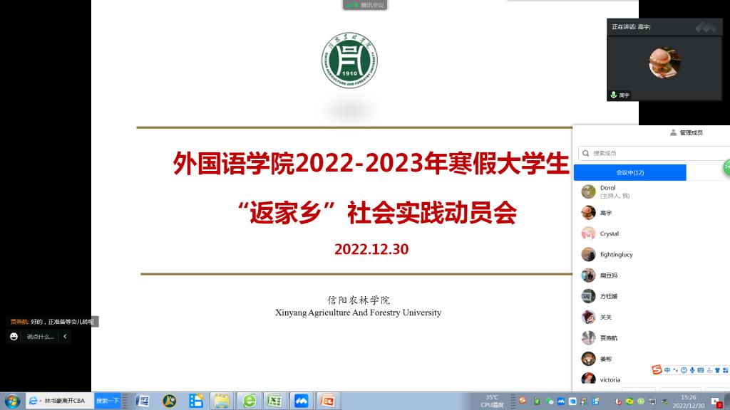 为引导大学生通过返乡实践更好地了解国情、感知社会、热爱家乡、服务群众,紧跟党走与人民群众相结合的成才道路,2022年12月30日,外国语学院召开了2022-2023年寒假大学生“返家乡”社会实践动员会。会议由团总支书记高宇主持,全体辅导员教师参会。