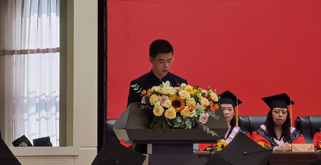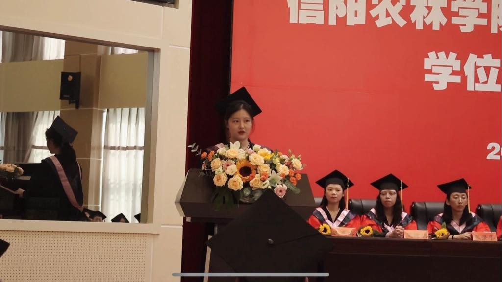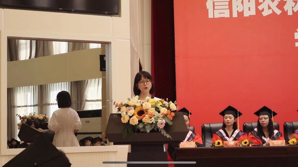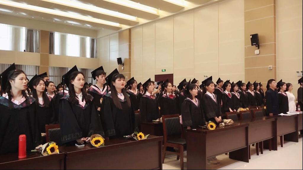 上午8时,外国语学院2023届学士学位授予仪式正式开始,全体师生起立奏唱国歌,随着庄严肃穆的国歌声响起,仪式正式拉开序幕。学校学位评定委员会委员、外国语学院学位评定分委员会主席、学院副院长芦晓莉宣读2023届毕业生学士学位授予决定。院党总支副书记吴宏宣读2023届毕业生学士学位授予名单,并向所有毕业生送上衷心的祝贺。仪式第四项,外国语学院教师代表、毕业生辅导员高宇向毕业生表示祝贺与感谢,以“在高山之巅,方见大河奔涌,在群山之上,更觉长风浩荡”向同学们表达了最真挚的祝福,寄语大家继续发扬志向立高远、学问做精细的校训;2023届毕业生代表邢柯回忆了在母校的日日夜夜和点点滴滴,表达了对对学校、学院、老师、同学们的感激和祝愿;在校生代表王严冬发言,他表达了对毕业生勇气和毅力的敬佩,鼓励学长学姐在以后的生活中不畏困难,勇敢向前,“莫愁前路无知己,天下谁人不识君”。随后,学院学位评定委员会成员集体为毕业生颁发学位证书。并一一为在场207名毕业生拨流苏。学院副院长芦晓莉致辞,寄语大家在未来长风破浪会有时、直挂云帆济沧海。在离别的乐曲中,学院向所有毕业生献上致2023届全体毕业生的一封信。仪式最后,师生合影留念,随着“咔嚓”声音的响起,这四年的时光定格在这一时刻。