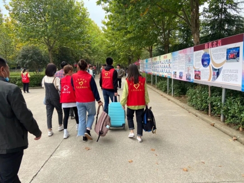 我院迎新志愿者为新生“保驾护航”,志愿者们身着红色志愿服,帮助新同学们将行李用小推车运送到宿舍,缔造小20们的“新家”。迎新志愿者们满怀热情、服务周到,用行动为新生带去温暖。
