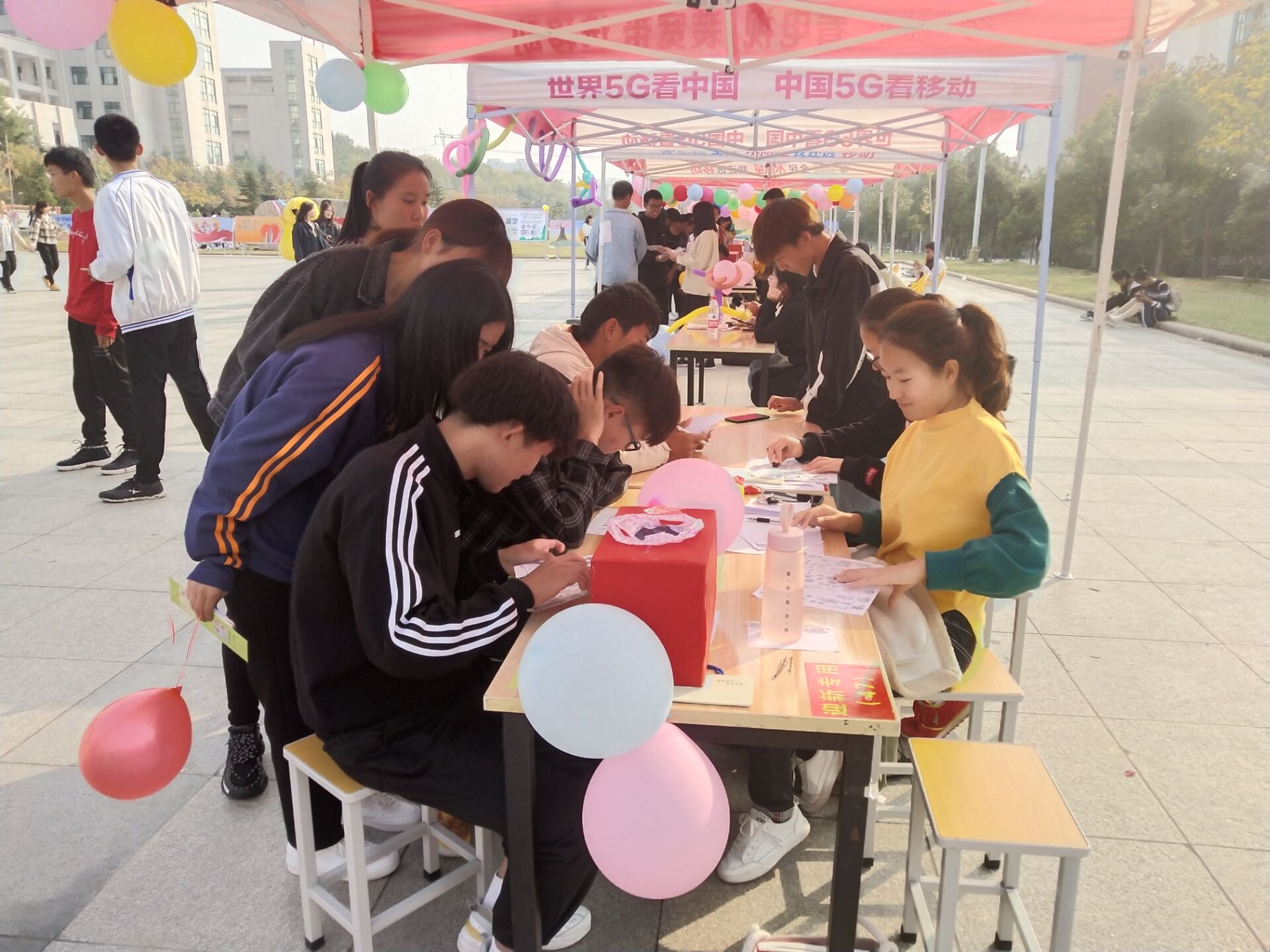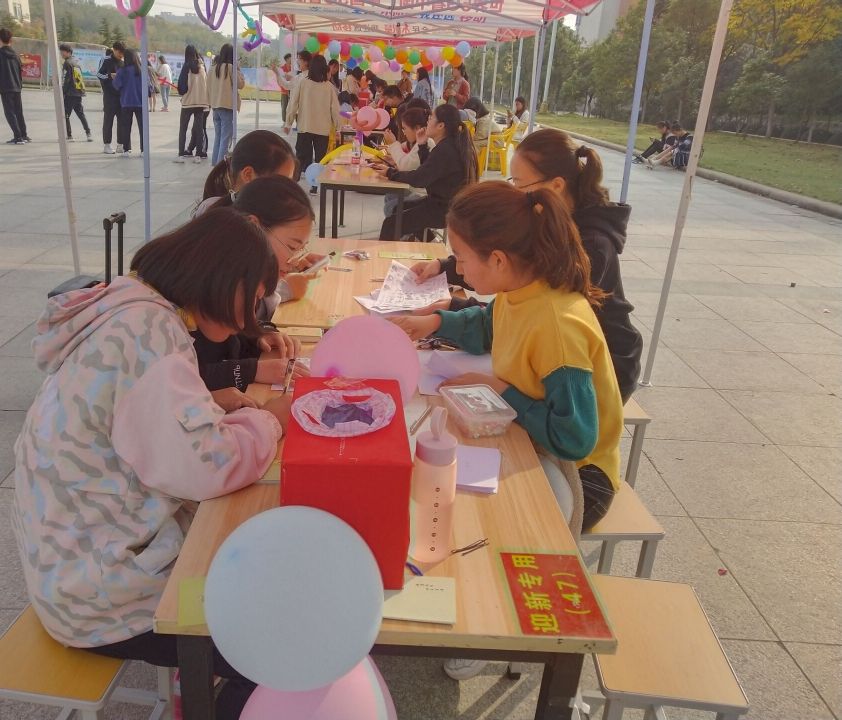 活动还未开始,负责活动的同学们便开始了准备工作,他们搭起了帐篷,摆好桌子凳子,把活动游戏需要的道具,奖品等准备就绪。下课铃声响后,便迎来了许多积极参与的同学。同学们通过参与“大家来找茬”,“抢凳子”,“画简笔画”,“踩气球”等小游戏,不仅得到了精美的小礼品,也在紧张学习的压力下得到了放松。在游戏结束后,同学们也参与了“陌生人你好”的活动,参加活动的同学可以用便利贴的形式随机抽出一张纸条,在上面给陌生人写出一句鼓励的话后再把纸条放回箱子中,在鼓励他人的同时,同学们也得到了他人的鼓励。活动最后,两部成员整理现场,清扫现场卫生,维护校园卫生。