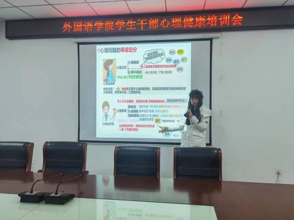3月23日外国语学院在文学艺术楼402开展学生干部心理健康培训讲座。心理健康与咨询中心杜鹃老师主讲,学院心理专员关迎雪、心理健康部成员、20、21、22级各班心理委员以及22级宿舍信息员参加此次培训讲座。