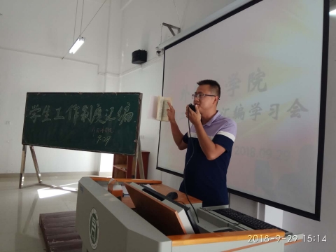 9月29日下午15时,外国语学院在二教404教室开展了《学生工作制度汇编》学习会,会议由新生辅导员张新亮老师主持,辅导员徐文君、卜菀萌、韩江霞及全体新生参与了本次学习会。