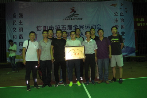 20179188时,信阳市浉河北岸琵琶台篮球场人声鼎沸,掌声如潮信阳市第五届全民运动会篮球比赛(成人组)的决赛暨闭幕式颁奖仪式在这里隆重举行。beat365在线平台官网工会副主席黄遵东,校篮球协会会长张志强和校篮球队全体队员参加了闭幕式典礼。