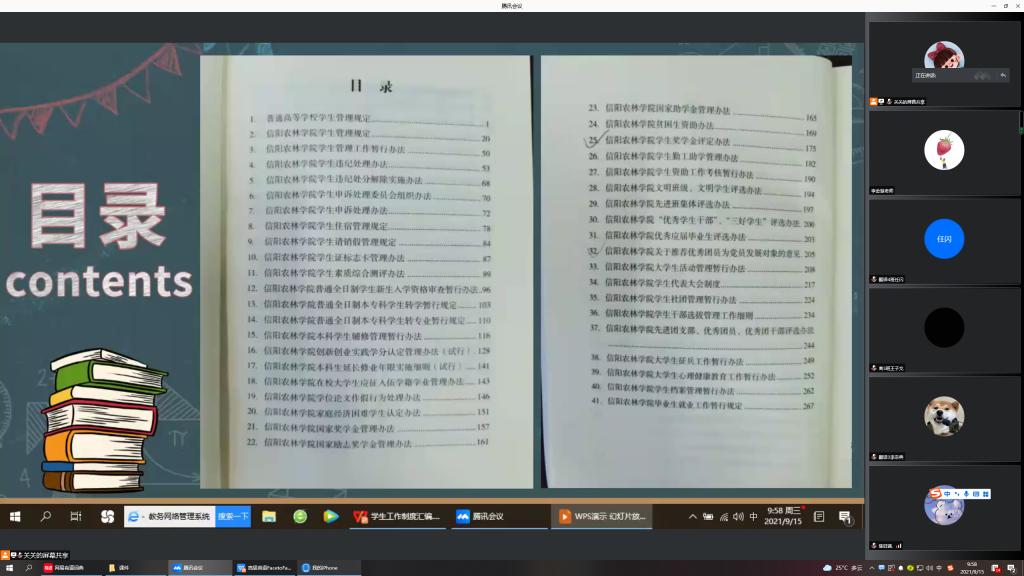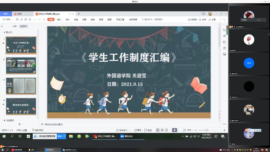 为做好新生入学安排工作,有序开展新生入学教育工作,加强同学们对学生工作制度的认识,9月15日上午,外国语学院利用腾讯会议线上平台举行了学生工作制度讲解会议。学院专职辅导员关迎雪负责此次会议的主持与讲解工作,2021级新生辅导员老师及全体21级新生参加此次会议。