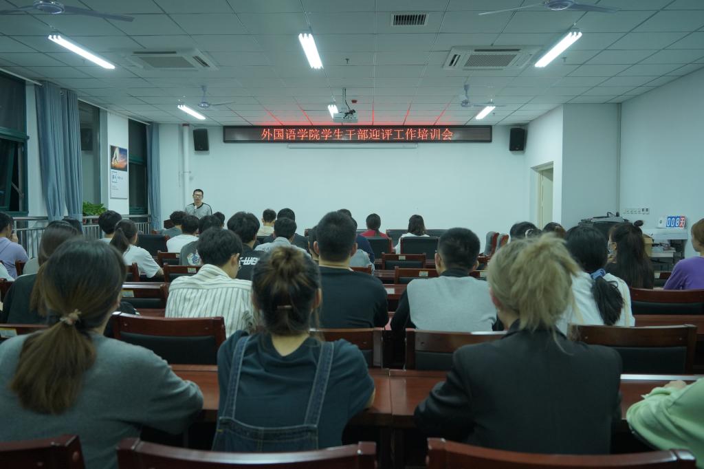 为迎接学校本科评估,提高学生干部的责任心和思想道德素质,外国语学院于919日晚在院办402召开了学生干部迎评工作培训会,培训由外国语学院党总支副书记吴宏主讲。