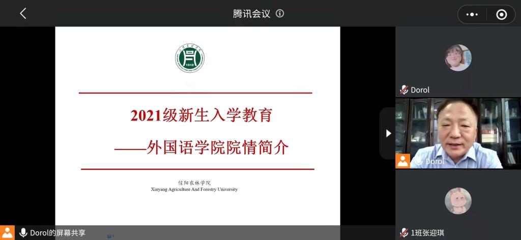 9月24日上午,外国语学院院长滕海、党总支书记张志强利用腾讯会议为全体21级新生做校情院情介绍,会议由高宇老师主持。