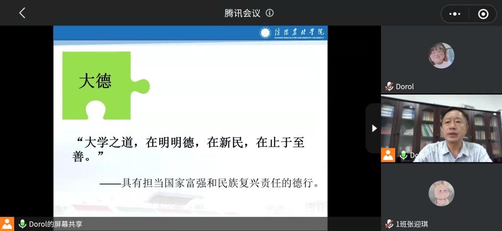 通过本次线上会议,同学们对大学学习和生活有了更深层次的了解。纷纷表示:一定会谨记校训院训,发扬信农精神,不负韶华,做好信农传承人,努力成为新时代社会主义事业的接班人,在奋斗中绽放出青春的光华。