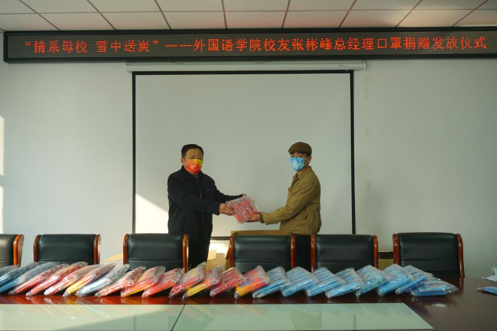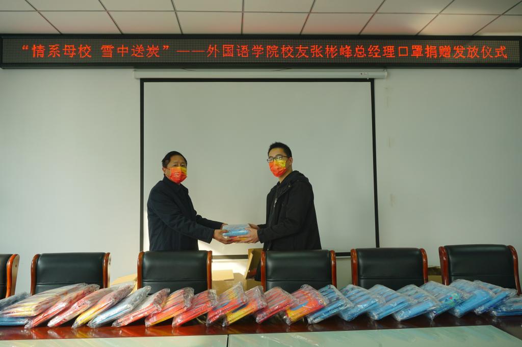 2021年12月10日,外国语学院2005届毕业生、现苏州(凯奇)迈克菲塑胶有限公司总经理张彬峰为表达对母校的感恩之情,向学院捐赠了一批一次性医用口罩。外国语学院院长滕海、党总支书记张志强、副书记吴宏代表学院进行了物资交接和发放仪式。