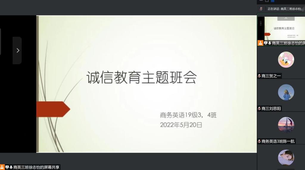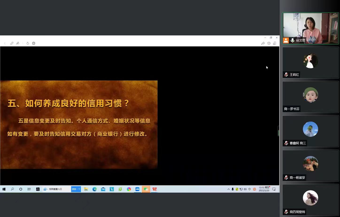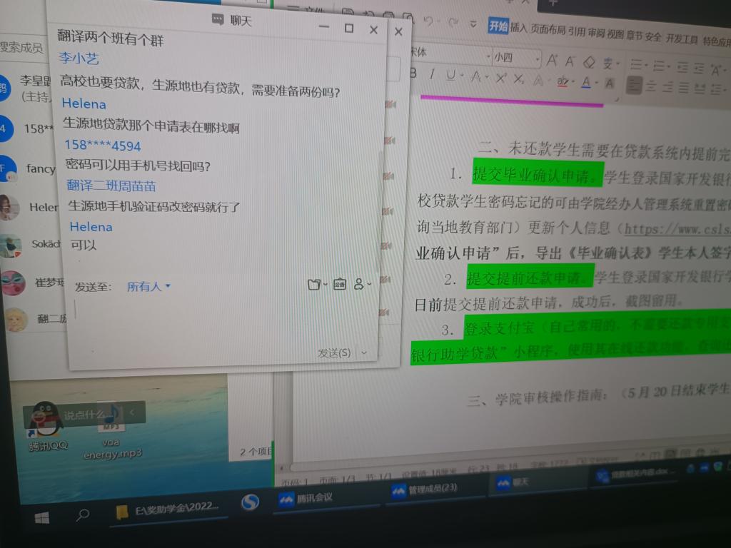 为了帮助毕业生明确还款申请流程和注意事项,我院资助专员张豫于5月13日和19日以腾讯会议的形式,为学生讲解了毕业确认注意事项,介绍贷款已结清、未结清两种情况下需要提供的证明材料和流程,解答学生对于提前还款申请是否可以撤销、是否会影响个人征信、部分还款和全部还款如何操作等问题;组织毕业生进行云宣誓并观看人民银行主题微电影《信用名片》,以更加生动的形式提醒学生注意个人信用,留意生活中与信用相关的点点滴滴。