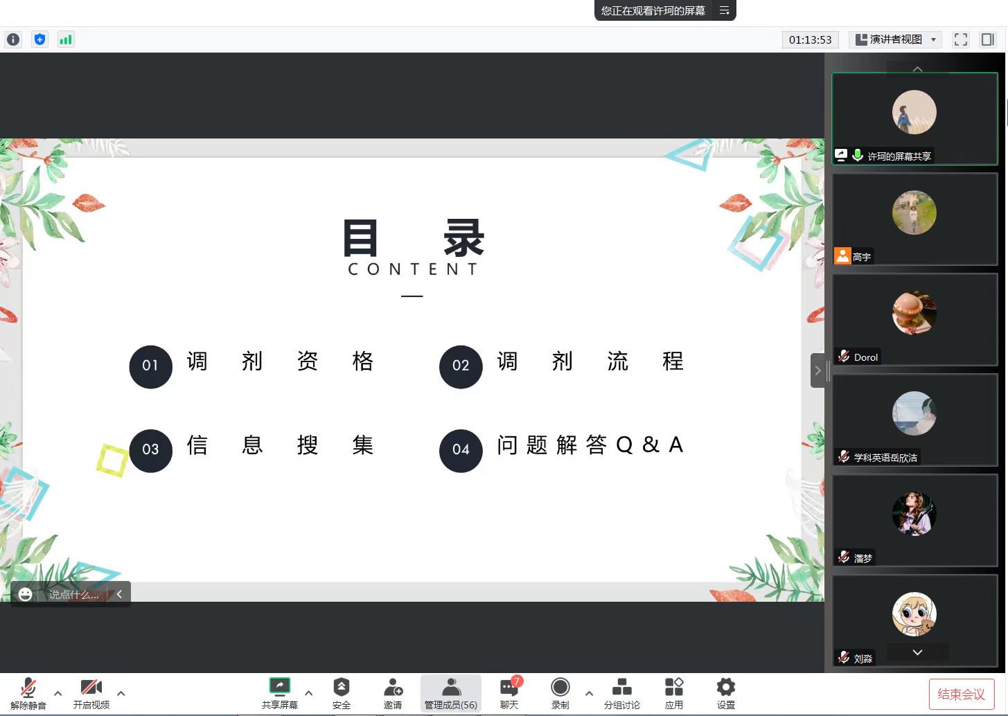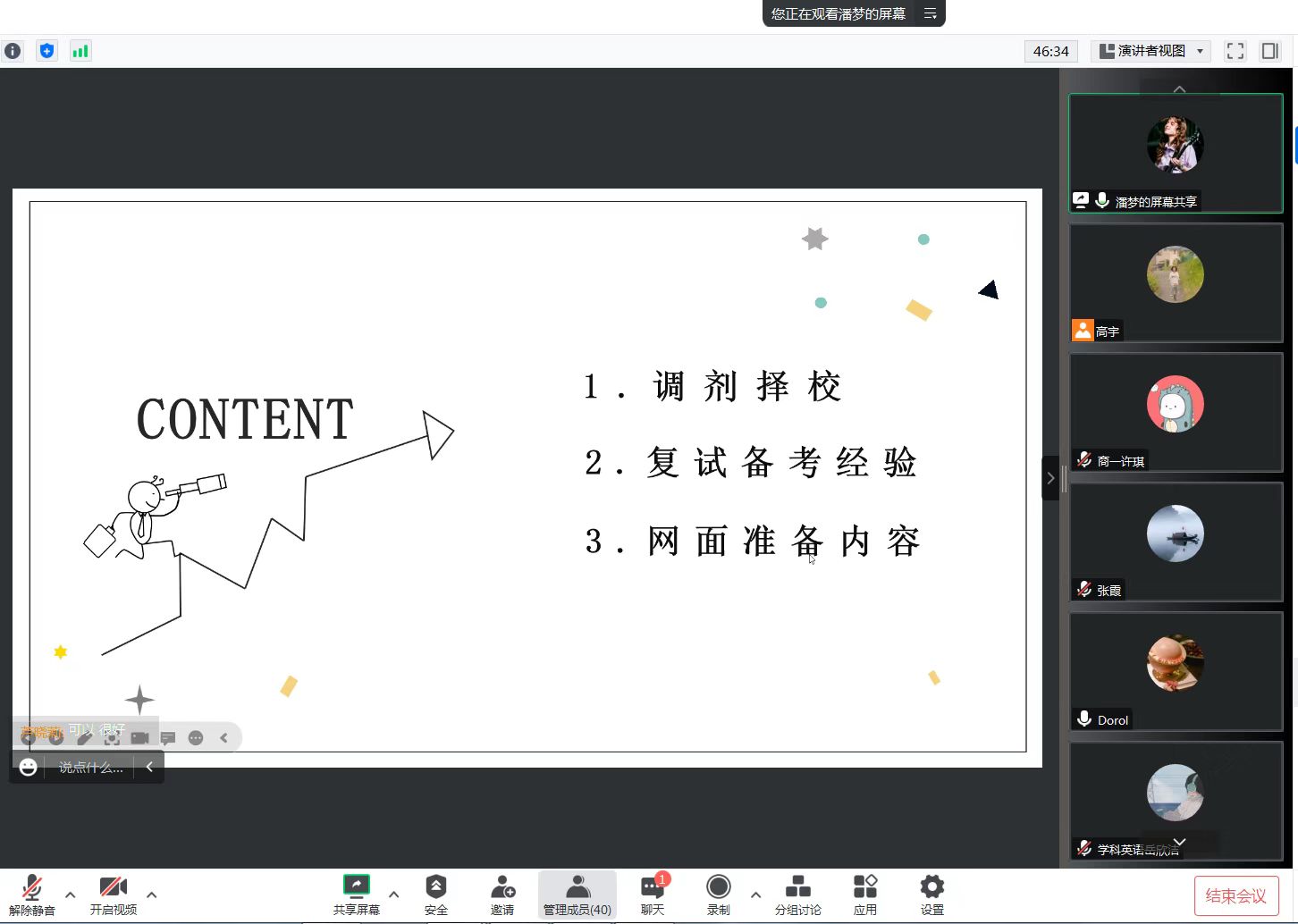 分享会上,张霞老师提醒考生们要注意复试及调剂的时间节点,在进行专业课备考时要注意不同题型的备考策略,在复试现场要注意心态仪态、突出履历亮点,并为大家介绍了导师选择、专业调剂等信息的搜集方法。随后,就读于河南理工大学学科教学(英语)专业的岳欣洁、大连外国语大学英语语言文学专业的潘梦、河北大学汉语国际教育专业的刘淼和宁夏大学翻译硕士(英语笔译)专业的许珂同学结合上岸经历和录取专业,从复试备考经验及调剂资格、择校和流程等方面,分享了个人经验,并回答了同学们提出的问题。