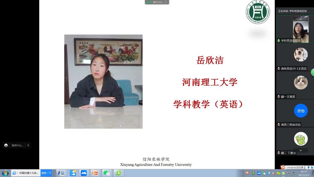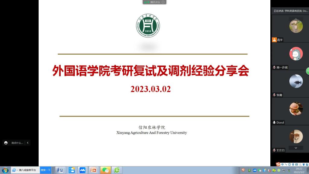 为进一步推进学院考研工作,提高学院考研学子复试及调剂技巧,3月2日晚20:00,外国语学院举办了线上考研复试及调剂经验分享交流会。副院长芦晓莉,党总支副书记吴宏,副院长蔡鸣、冯昱,商务英语教研室主任张霞以及学院2023届考研学生和部分在校学子参加了本次会议,会议由团总支书记高宇主持。