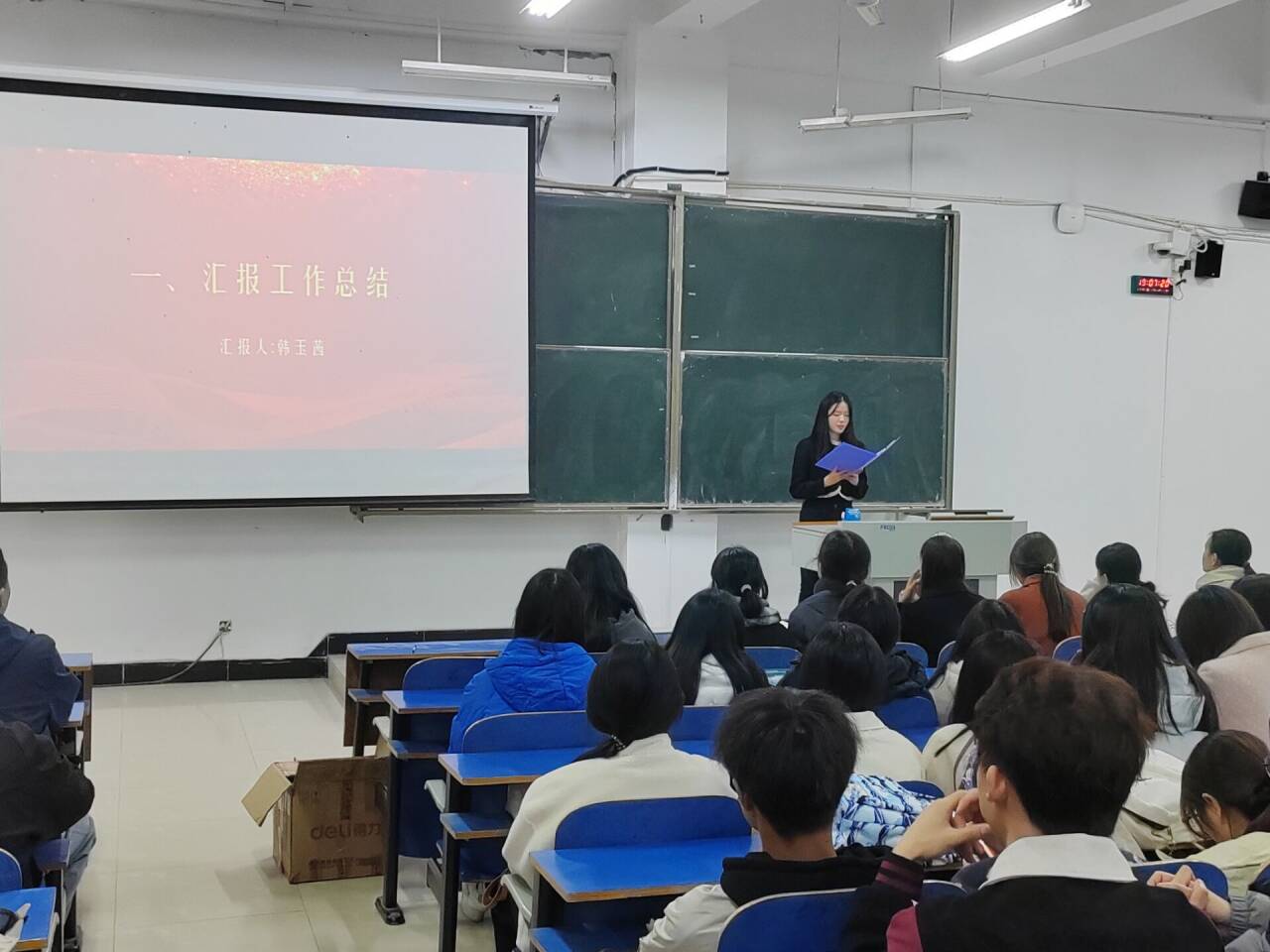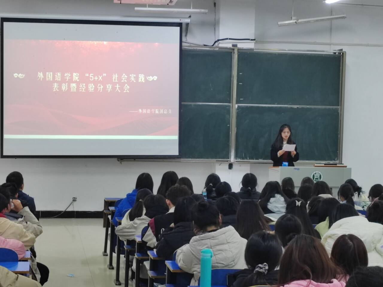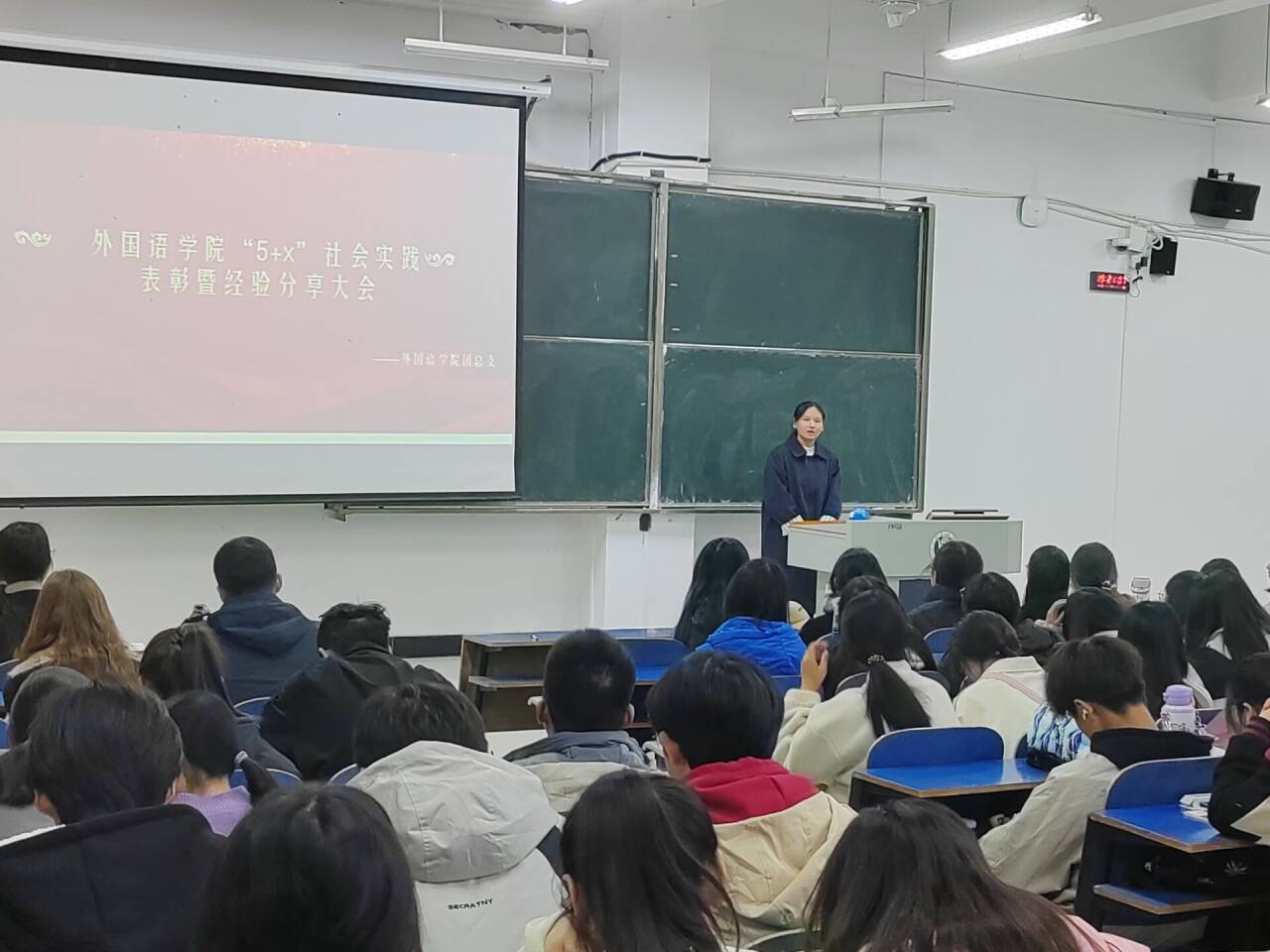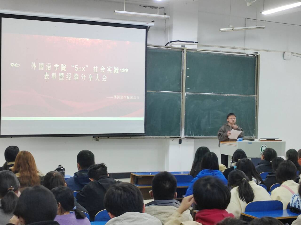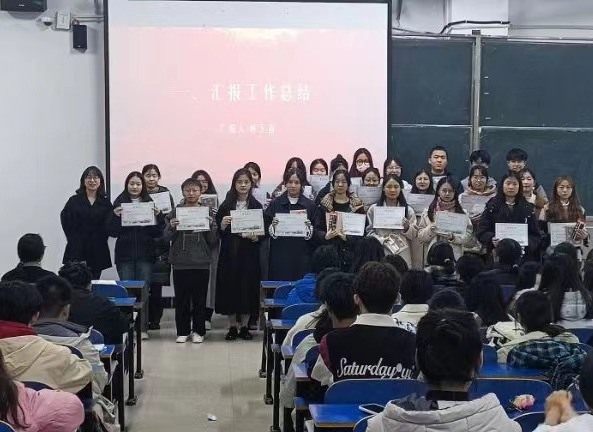 2023年11月16日晚,外国语学院于一教E102举办了社会实践表彰暨经验分享大会。院团总支书记高宇、21和22级受表彰学生、23级全体同学参加了此次大会。