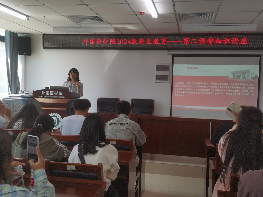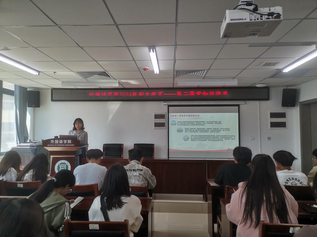 2024年9月25日上午,外国语学院于3B实验楼206开展了团务知识讲座及第二课堂知识讲座。讲座由院团总支书记高宇主讲,2024级全体新生参加。