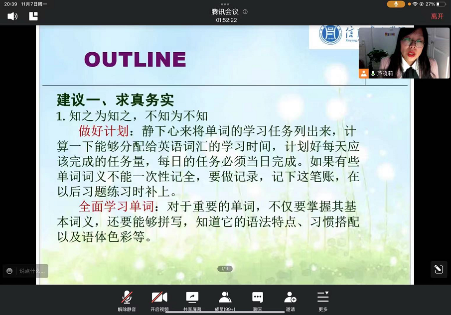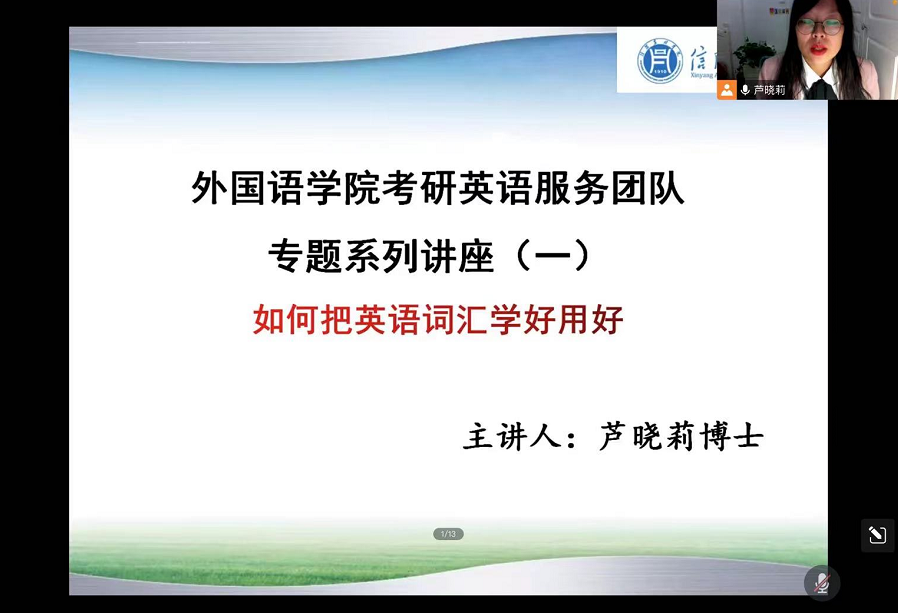 2022年11月7日19:00-21:00,考研英语服务团队于腾讯会议开启第一场题为“如何学好用好英语词汇”的专题讲座暨学院第二期博士论坛,本次讲座由外国语学院芦晓莉博士主讲,全校300余名师生参会。