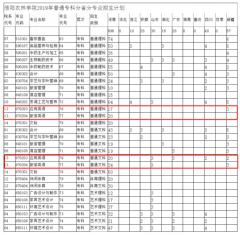 外国语学院2019年普通专科分省分专业招生计划